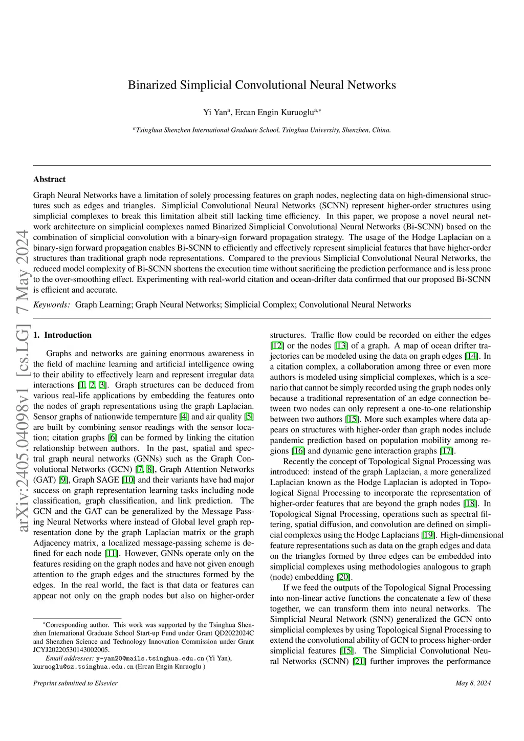 Graph Neural Networks have a limitation of solely processing features on graph nodes, neglecting data on high-dimensional structures such as edges and triangles. Simplicial Convolutional Neural Networks (SCNN) represent higher-order structures using simplicial complexes to break this limitation albeit still lacking time efficiency. In this paper, we propose a novel neural network architecture on simplicial complexes named Binarized Simplicial Convolutional Neural Networks (Bi-SCNN) based on the combination of simplicial convolution with a binary-sign forward propagation strategy. The usage of the Hodge Laplacian on a binary-sign forward propagation enables Bi-SCNN to efficiently and effectively represent simplicial features that have higher-order structures than traditional graph node representations. Compared to the previous Simplicial Convolutional Neural Networks, the reduced model complexity of Bi-SCNN shortens the execution time without sacrificing the prediction performance and is less prone to the over-smoothing effect. Experimenting with real-world citation and ocean-drifter data confirmed that our proposed Bi-SCNN is efficient and accurate.