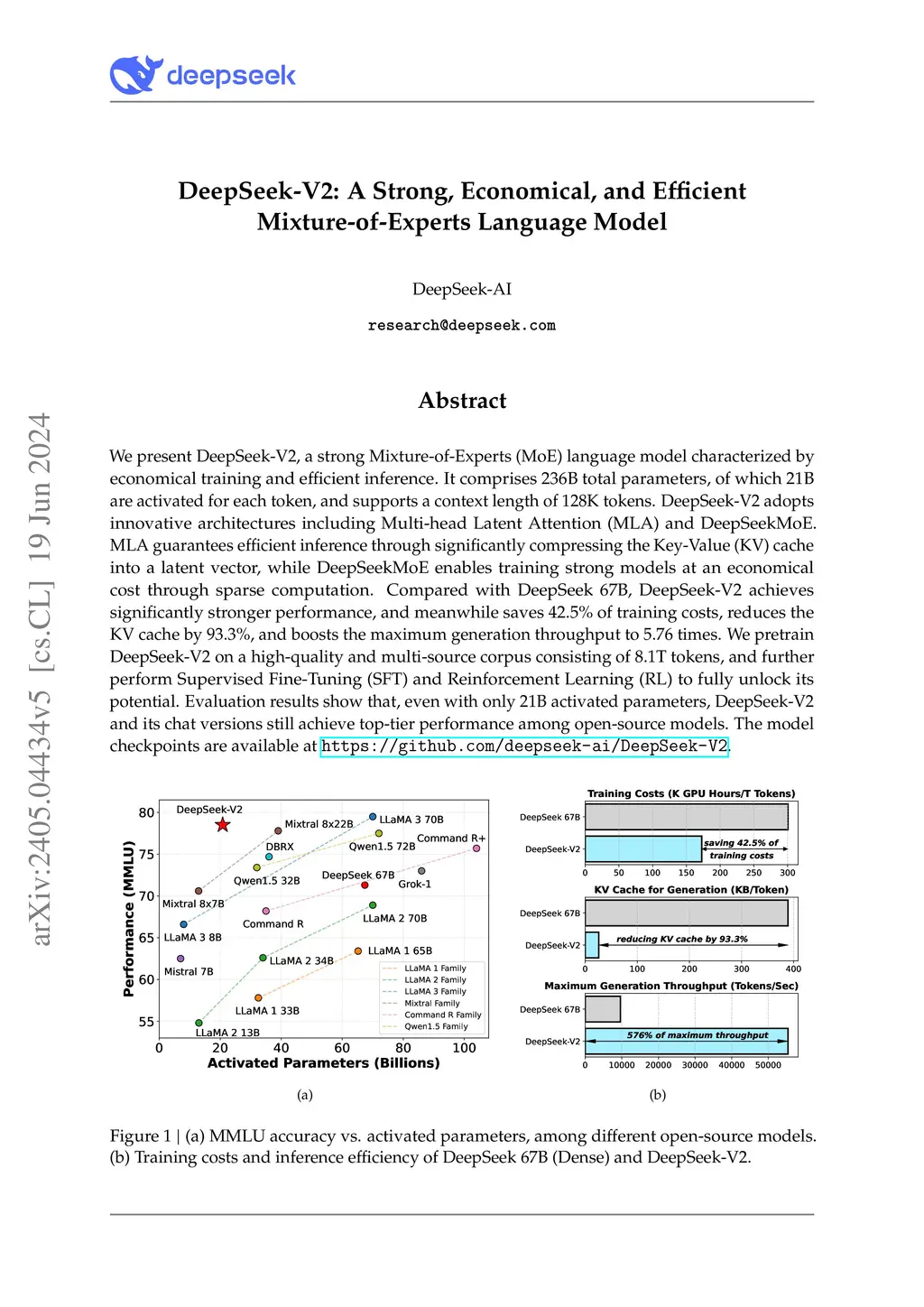 We present DeepSeek-V2, a strong Mixture-of-Experts (MoE) language model characterized by economical training and efficient inference. It comprises 236B total parameters, of which 21B are activated for each token, and supports a context length of 128K tokens. DeepSeek-V2 adopts innovative architectures including Multi-head Latent Attention (MLA) and DeepSeekMoE. MLA guarantees efficient inference through significantly compressing the Key-Value (KV) cache into a latent vector, while DeepSeekMoE enables training strong models at an economical cost through sparse computation. Compared with DeepSeek 67B, DeepSeek-V2 achieves significantly stronger performance, and meanwhile saves 42.5% of training costs, reduces the KV cache by 93.3%, and boosts the maximum generation throughput to 5.76 times. We pretrain DeepSeek-V2 on a high-quality and multi-source corpus consisting of 8.1T tokens, and further perform Supervised Fine-Tuning (SFT) and Reinforcement Learning (RL) to fully unlock its potential. Evaluation results show that, even with only 21B activated parameters, DeepSeek-V2 and its chat versions still achieve top-tier performance among open-source models.