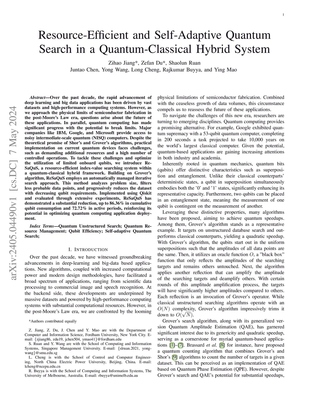 Over the past decade, the rapid advancement of deep learning and big data applications has been driven by vast datasets and high-performance computing systems. However, as we approach the physical limits of semiconductor fabrication in the post-Moore's Law era, questions arise about the future of these applications. In parallel, quantum computing has made significant progress with the potential to break limits. Major companies like IBM, Google, and Microsoft provide access to noisy intermediate-scale quantum (NISQ) computers. Despite the theoretical promise of Shor's and Grover's algorithms, practical implementation on current quantum devices faces challenges, such as demanding additional resources and a high number of controlled operations. To tackle these challenges and optimize the utilization of limited onboard qubits, we introduce ReSaQuS, a resource-efficient index-value searching system within a quantum-classical hybrid framework. Building on Grover's algorithm, ReSaQuS employs an automatically managed iterative search approach. This method analyzes problem size, filters fewer probable data points, and progressively reduces the dataset with decreasing qubit requirements. Implemented using Qiskit and evaluated through extensive experiments, ReSaQuS has demonstrated a substantial reduction, up to 86.36\% in cumulative qubit consumption and 72.72\% in active periods, reinforcing its potential in optimizing quantum computing application deployment.