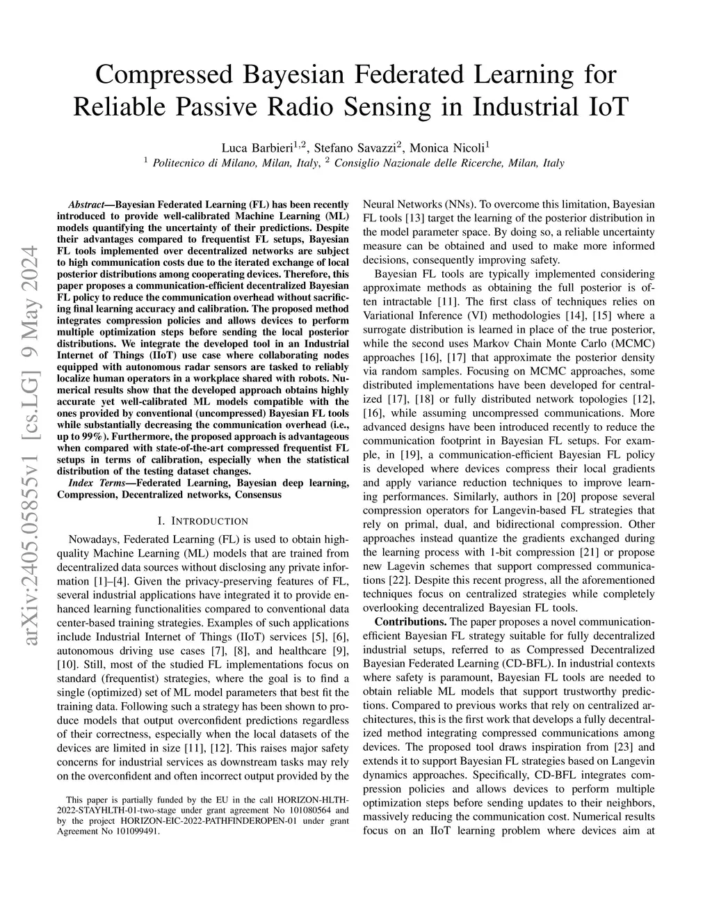 Bayesian Federated Learning (FL) has been recently introduced to provide well-calibrated Machine Learning (ML) models quantifying the uncertainty of their predictions. Despite their advantages compared to frequentist FL setups, Bayesian FL tools implemented over decentralized networks are subject to high communication costs due to the iterated exchange of local posterior distributions among cooperating devices. Therefore, this paper proposes a communication-efficient decentralized Bayesian FL policy to reduce the communication overhead without sacrificing final learning accuracy and calibration. The proposed method integrates compression policies and allows devices to perform multiple optimization steps before sending the local posterior distributions. We integrate the developed tool in an Industrial Internet of Things (IIoT) use case where collaborating nodes equipped with autonomous radar sensors are tasked to reliably localize human operators in a workplace shared with robots. Numerical results show that the developed approach obtains highly accurate yet well-calibrated ML models compatible with the ones provided by conventional (uncompressed) Bayesian FL tools while substantially decreasing the communication overhead (i.e., up to 99%). Furthermore, the proposed approach is advantageous when compared with state-of-the-art compressed frequentist FL setups in terms of calibration, especially when the statistical distribution of the testing dataset changes.