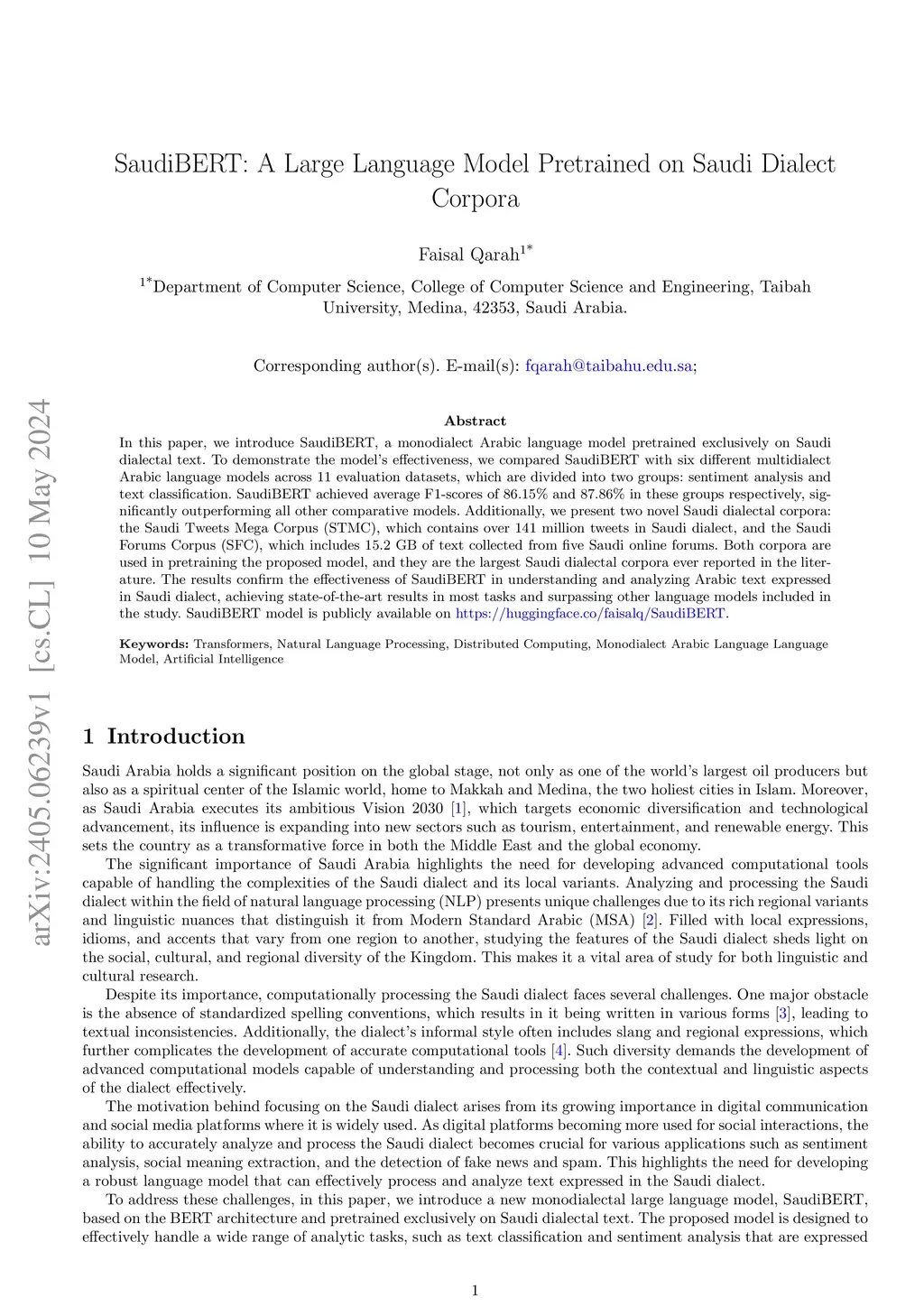 SaudiBERT: A Large Language Model Pretrained on Saudi Dialect Corpora