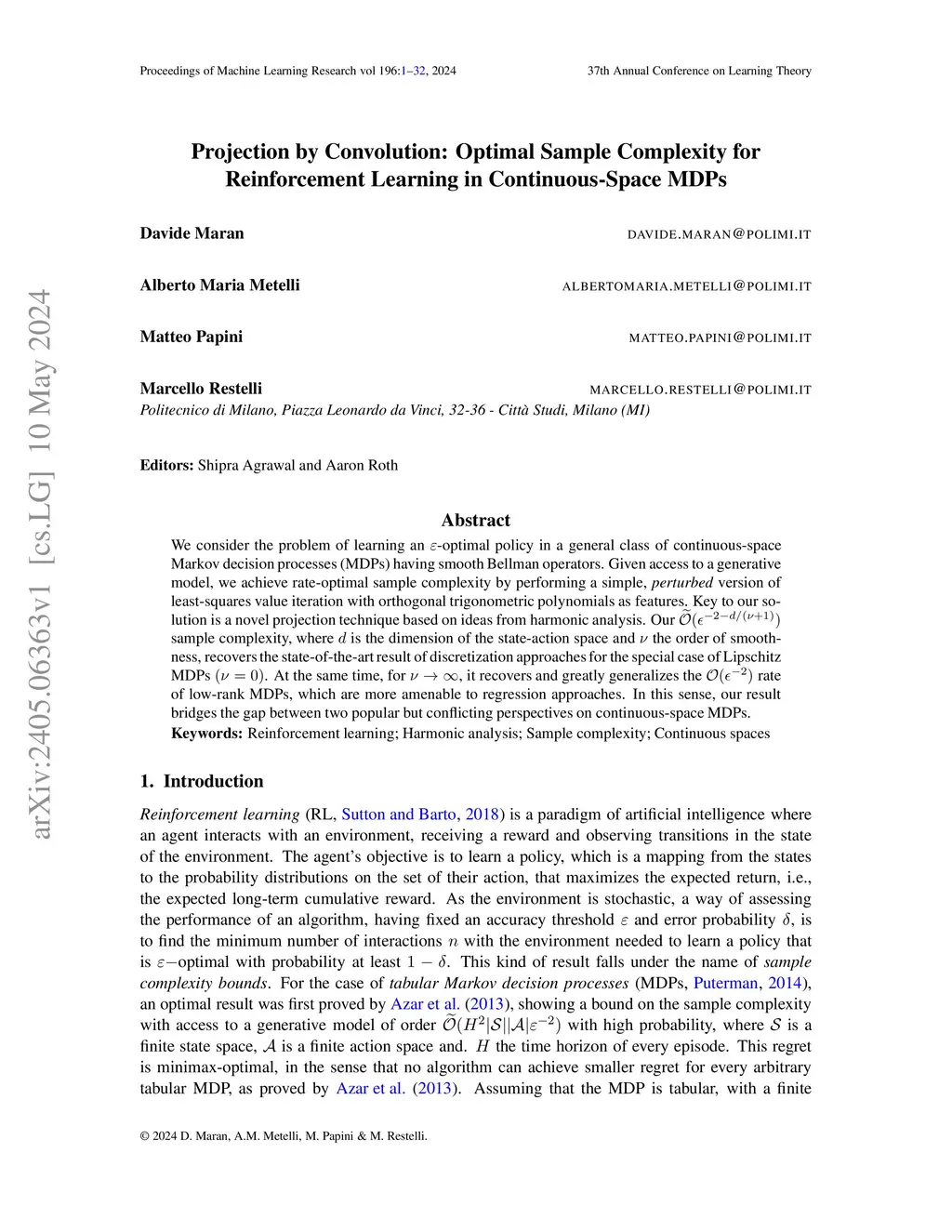 Projection by Convolution: Optimal Sample Complexity for Reinforcement