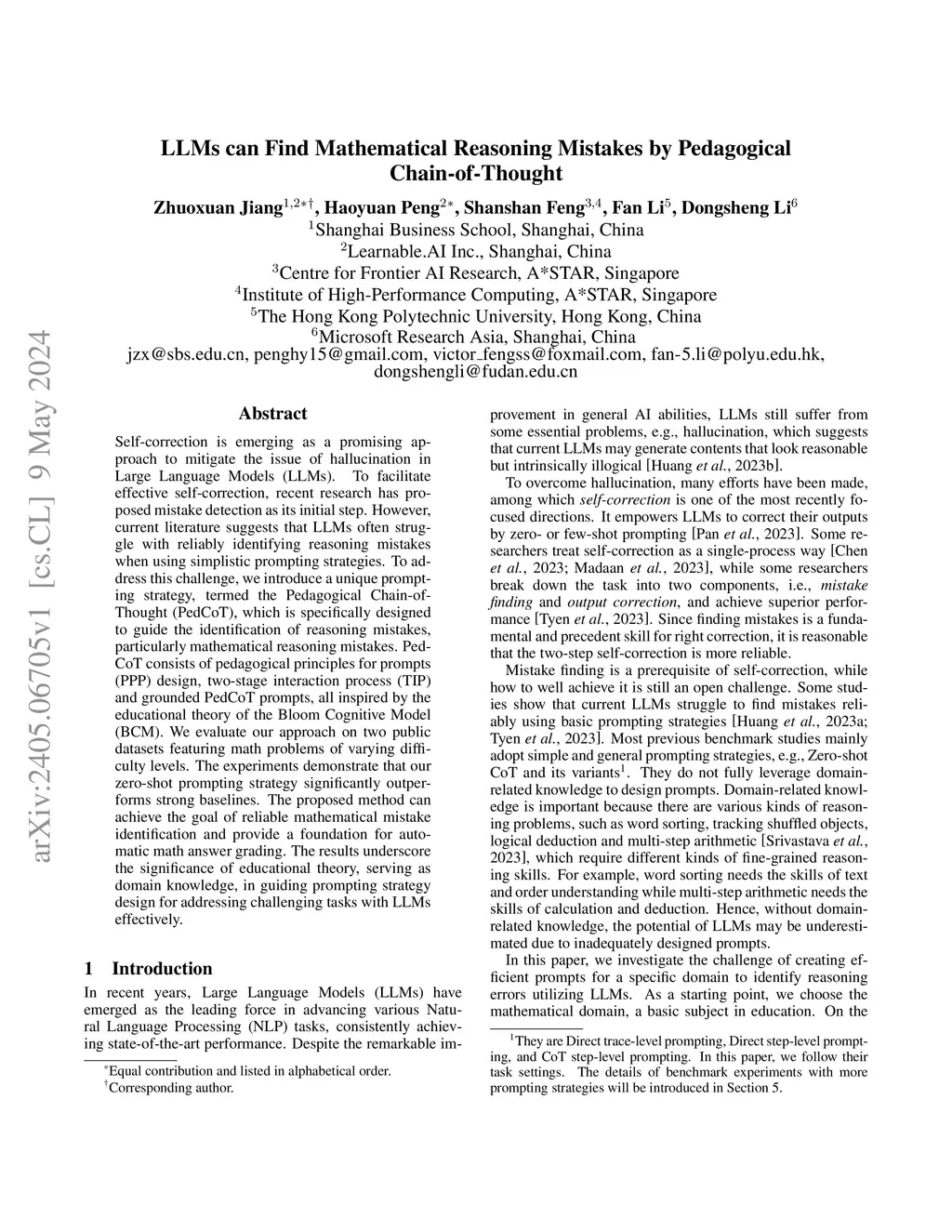 Self-correction is emerging as a promising approach to mitigate the issue of hallucination in Large Language Models (LLMs). To facilitate effective self-correction, recent research has proposed mistake detection as its initial step. However, current literature suggests that LLMs often struggle with reliably identifying reasoning mistakes when using simplistic prompting strategies. To address this challenge, we introduce a unique prompting strategy, termed the Pedagogical Chain-of-Thought (PedCoT), which is specifically designed to guide the identification of reasoning mistakes, particularly mathematical reasoning mistakes. PedCoT consists of pedagogical principles for prompts (PPP) design, two-stage interaction process (TIP) and grounded PedCoT prompts, all inspired by the educational theory of the Bloom Cognitive Model (BCM). We evaluate our approach on two public datasets featuring math problems of varying difficulty levels. The experiments demonstrate that our zero-shot prompting strategy significantly outperforms strong baselines. The proposed method can achieve the goal of reliable mathematical mistake identification and provide a foundation for automatic math answer grading. The results underscore the significance of educational theory, serving as domain knowledge, in guiding prompting strategy design for addressing challenging tasks with LLMs effectively.