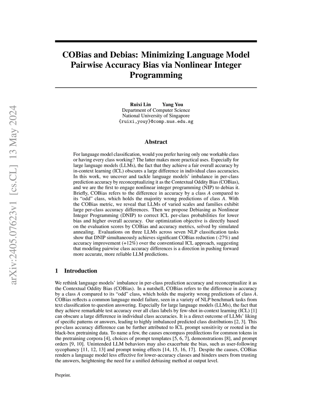 Large language models (LLMs) are good knowledge bases but struggle to perform equally well for all classes in text classification tasks. This paper investigates a fundamental inference-time problem in language models: imbalanced class accuracies. We find what's underneath the issue is a tendency to over-predict some classes while under-predicting some others. This class accuracy imbalance is difficult to solve from the root via better pre-training or fine-tuning strategies, but we show it can be effectively mitigated via inference-time combinatorial optimization. To this end, we conceptualize and quantify the over- and under-prediction issue as the Contextual Oddity Bias (COBias), and propose the Debiasing as Nonlinear Integer Programming (DNIP) model to correct in-context learned class probabilities based on minimizing COBias and maximizing overall accuracy, without LLM parameter update. Considering that the DNIP model implicitly contains non-differentiable elements, we therefore use the simulated annealing algorithm to solve it. Extensive evaluations on three LLMs across seven NLP classification tasks in different prompting settings show that DNIP simultaneously achieves significant COBias reduction (-27%) and accuracy improvement (+12%) over the conventional ICL approach, suggesting that inference-time mitigation of class accuracy imbalance is a promising direction to push forward LLM performances.