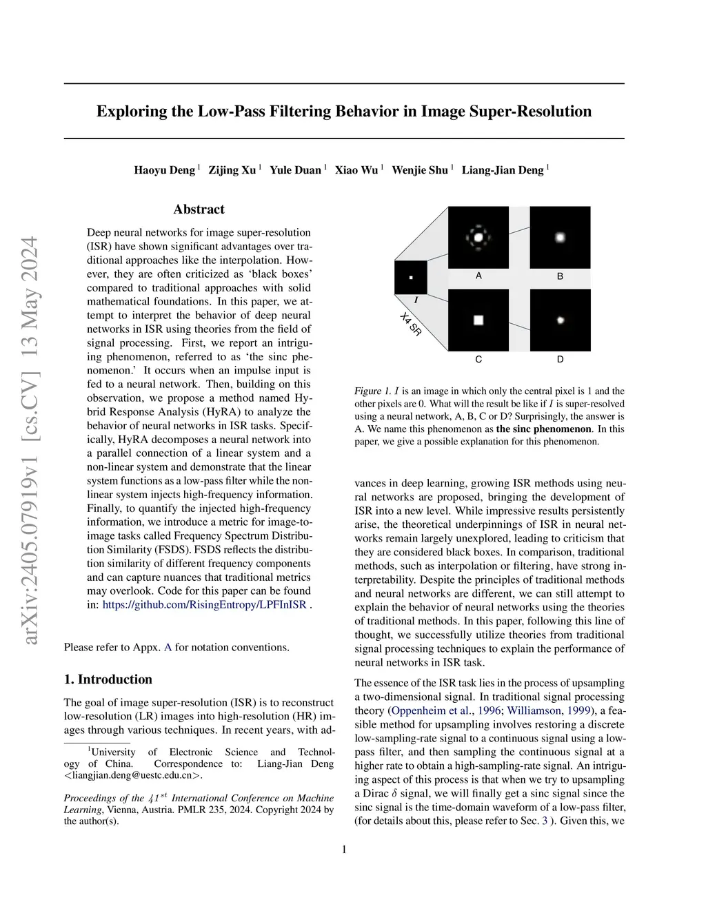 Deep neural networks for image super-resolution (ISR) have shown significant advantages over traditional approaches like the interpolation. However, they are often criticized as 'black boxes' compared to traditional approaches with solid mathematical foundations. In this paper, we attempt to interpret the behavior of deep neural networks in ISR using theories from the field of signal processing. First, we report an intriguing phenomenon, referred to as `the sinc phenomenon.' It occurs when an impulse input is fed to a neural network. Then, building on this observation, we propose a method named Hybrid Response Analysis (HyRA) to analyze the behavior of neural networks in ISR tasks. Specifically, HyRA decomposes a neural network into a parallel connection of a linear system and a non-linear system and demonstrates that the linear system functions as a low-pass filter while the non-linear system injects high-frequency information. Finally, to quantify the injected high-frequency information, we introduce a metric for image-to-image tasks called Frequency Spectrum Distribution Similarity (FSDS). FSDS reflects the distribution similarity of different frequency components and can capture nuances that traditional metrics may overlook. Code, videos and raw experimental results for this paper can be found in: https://github.com/RisingEntropy/LPFInISR.
