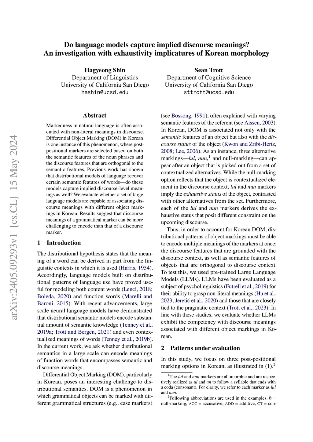 Markedness in natural language is often associated with non-literal meanings in discourse. Differential Object Marking (DOM) in Korean is one instance of this phenomenon, where post-positional markers are selected based on both the semantic features of the noun phrases and the discourse features that are orthogonal to the semantic features. Previous work has shown that distributional models of language recover certain semantic features of words -- do these models capture implied discourse-level meanings as well? We evaluate whether a set of large language models are capable of associating discourse meanings with different object markings in Korean. Results suggest that discourse meanings of a grammatical marker can be more challenging to encode than that of a discourse marker.