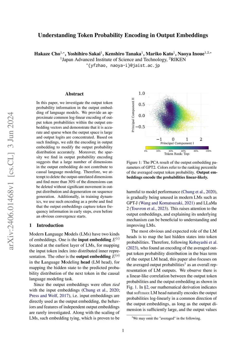 In this paper, we investigate the output token probability information in the output embedding of language models. We provide an approximate common log-linear encoding of output token probabilities within the output embedding vectors and demonstrate that it is accurate and sparse when the output space is large and output logits are concentrated. Based on such findings, we edit the encoding in output embedding to modify the output probability distribution accurately. Moreover, the sparsity we find in output probability encoding suggests that a large number of dimensions in the output embedding do not contribute to causal language modeling. Therefore, we attempt to delete the output-unrelated dimensions and find more than 30% of the dimensions can be deleted without significant movement in output distribution and degeneration on sequence generation. Additionally, in training dynamics, we use such encoding as a probe and find that the output embeddings capture token frequency information in early steps, even before an obvious convergence starts.