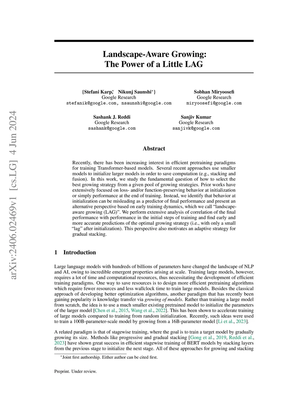 Recently, there has been increasing interest in efficient pretraining paradigms for training Transformer-based models. Several recent approaches use smaller models to initialize larger models in order to save computation (e.g., stacking and fusion). In this work, we study the fundamental question of how to select the best growing strategy from a given pool of growing strategies. Prior works have extensively focused on loss- and/or function-preserving behavior at initialization or simply performance at the end of training. Instead, we identify that behavior at initialization can be misleading as a predictor of final performance and present an alternative perspective based on early training dynamics, which we call "landscape-aware growing (LAG)". We perform extensive analysis of correlation of the final performance with performance in the initial steps of training and find early and more accurate predictions of the optimal growing strategy (i.e., with only a small "lag" after initialization). This perspective also motivates an adaptive strategy for gradual stacking.