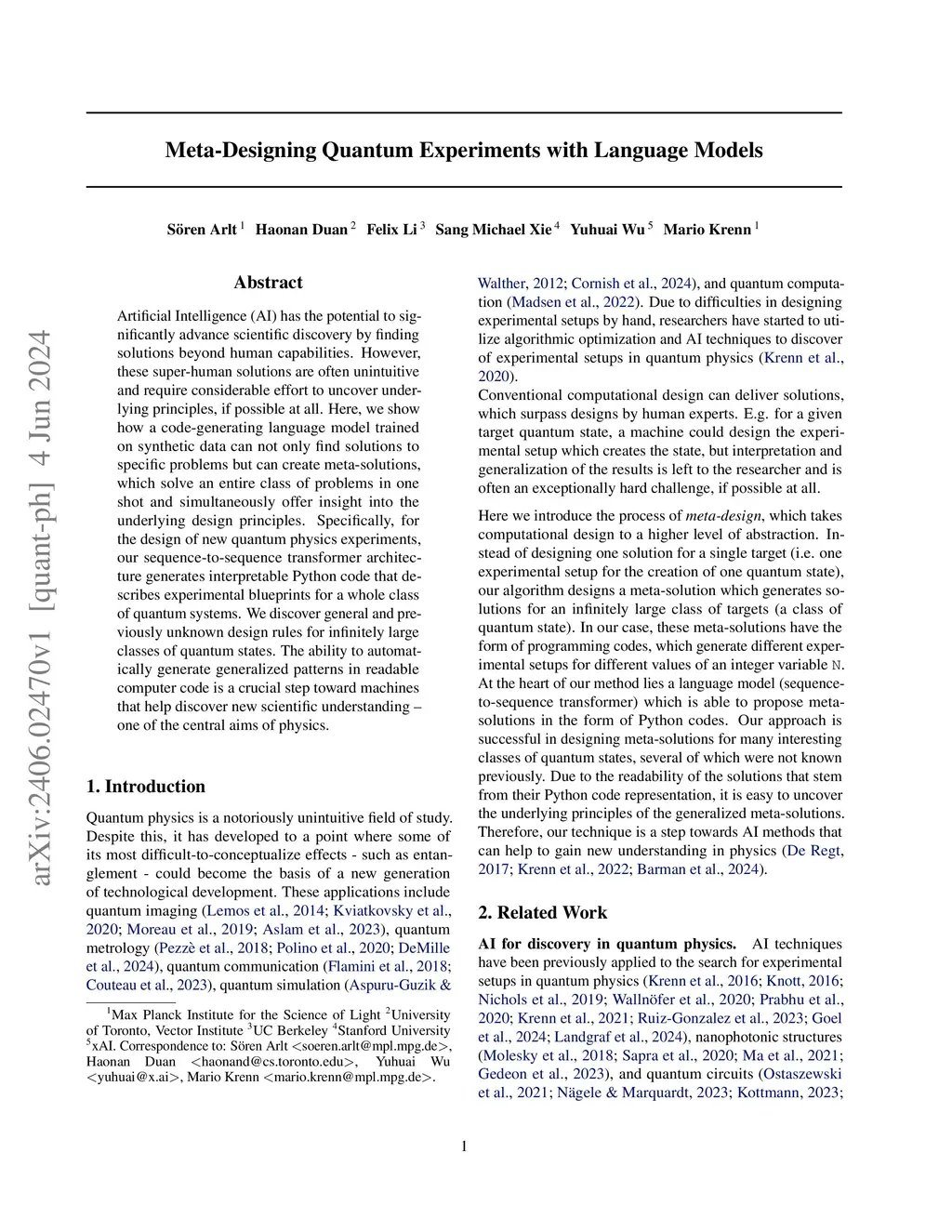 Artificial Intelligence (AI) can solve complex scientific problems beyond human capabilities, but the resulting solutions offer little insight into the underlying physical principles. One prominent example is quantum physics, where computers can discover experiments for the generation of specific quantum states, but it is unclear how finding general design concepts can be automated. Here, we address this challenge by training a transformer-based language model to create human-readable Python code, which solves an entire class of problems in a single pass. This strategy, which we call meta-design, enables scientists to gain a deeper understanding and extrapolate to larger experiments without additional optimization. To demonstrate the effectiveness of our approach, we uncover previously unknown experimental generalizations of important quantum states, e.g. from condensed matter physics. The underlying methodology of meta-design can naturally be extended to fields such as materials science or engineering.