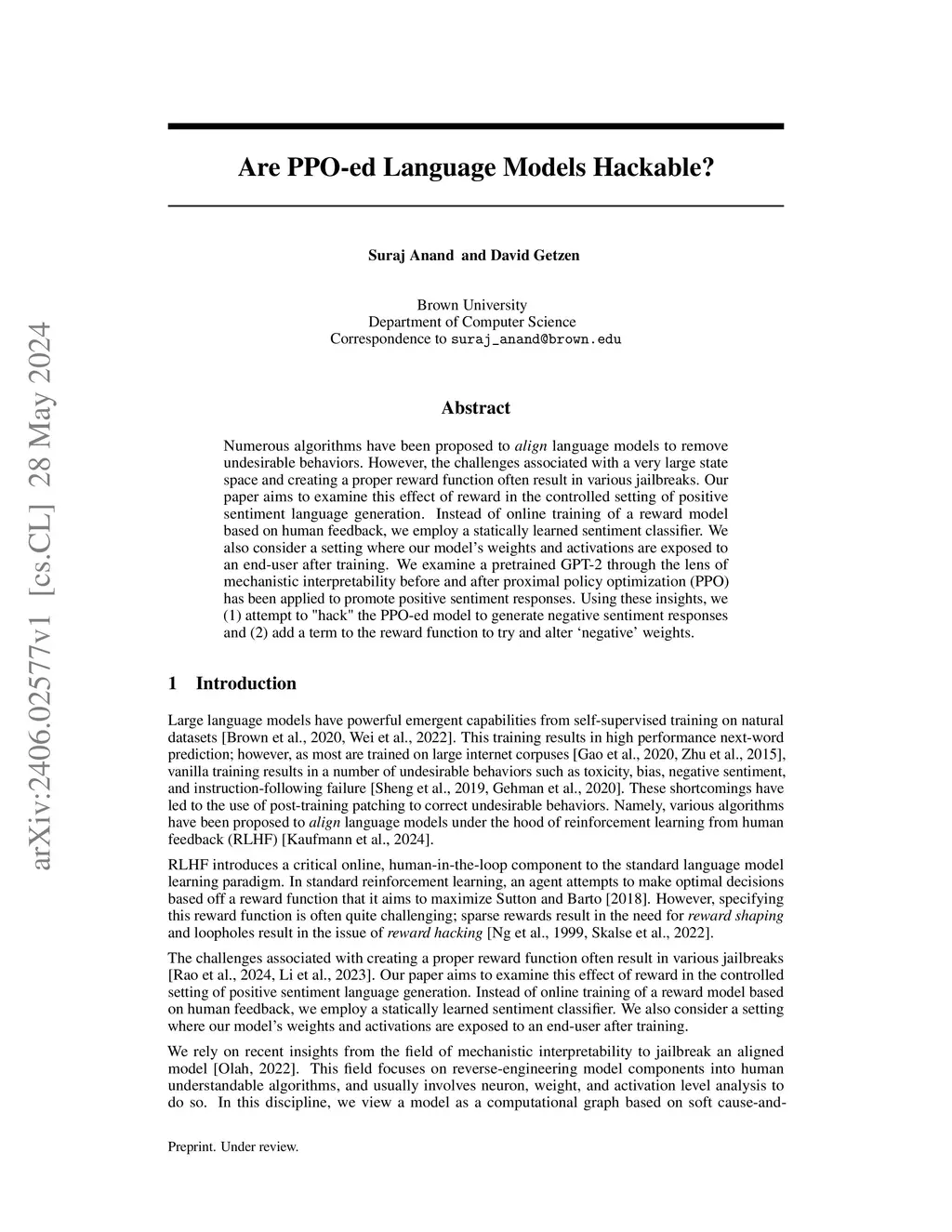 Numerous algorithms have been proposed to language models to remove undesirable behaviors. However, the challenges associated with a very large state space and creating a proper reward function often result in various jailbreaks. Our paper aims to examine this effect of reward in the controlled setting of positive sentiment language generation. Instead of online training of a reward model based on human feedback, we employ a statically learned sentiment classifier. We also consider a setting where our model's weights and activations are exposed to an end-user after training. We examine a pretrained GPT-2 through the lens of mechanistic interpretability before and after proximal policy optimization (PPO) has been applied to promote positive sentiment responses. Using these insights, we (1) attempt to "hack" the PPO-ed model to generate negative sentiment responses and (2) add a term to the reward function to try and alter `negative' weights.