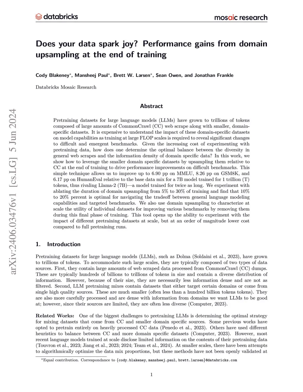 Pretraining datasets for large language models (LLMs) have grown to trillions of tokens composed of large amounts of CommonCrawl (CC) web scrape along with smaller, domain-specific datasets. It is expensive to understand the impact of these domain-specific datasets on model capabilities as training at large FLOP scales is required to reveal significant changes to difficult and emergent benchmarks. Given the increasing cost of experimenting with pretraining data, how does one determine the optimal balance between the diversity in general web scrapes and the information density of domain specific data? In this work, we show how to leverage the smaller domain specific datasets by upsampling them relative to CC at the end of training to drive performance improvements on difficult benchmarks. This simple technique allows us to improve up to 6.90 pp on MMLU, 8.26 pp on GSM8K, and 6.17 pp on HumanEval relative to the base data mix for a 7B model trained for 1 trillion (T) tokens, thus rivaling Llama-2 (7B)a model trained for twice as long. We experiment with ablating the duration of domain upsampling from 5% to 30% of training and find that 10% to 20% percent is optimal for navigating the tradeoff between general language modeling capabilities and targeted benchmarks. We also use domain upsampling to characterize at scale the utility of individual datasets for improving various benchmarks by removing them during this final phase of training. This tool opens up the ability to experiment with the impact of different pretraining datasets at scale, but at an order of magnitude lower cost compared to full pretraining runs.
