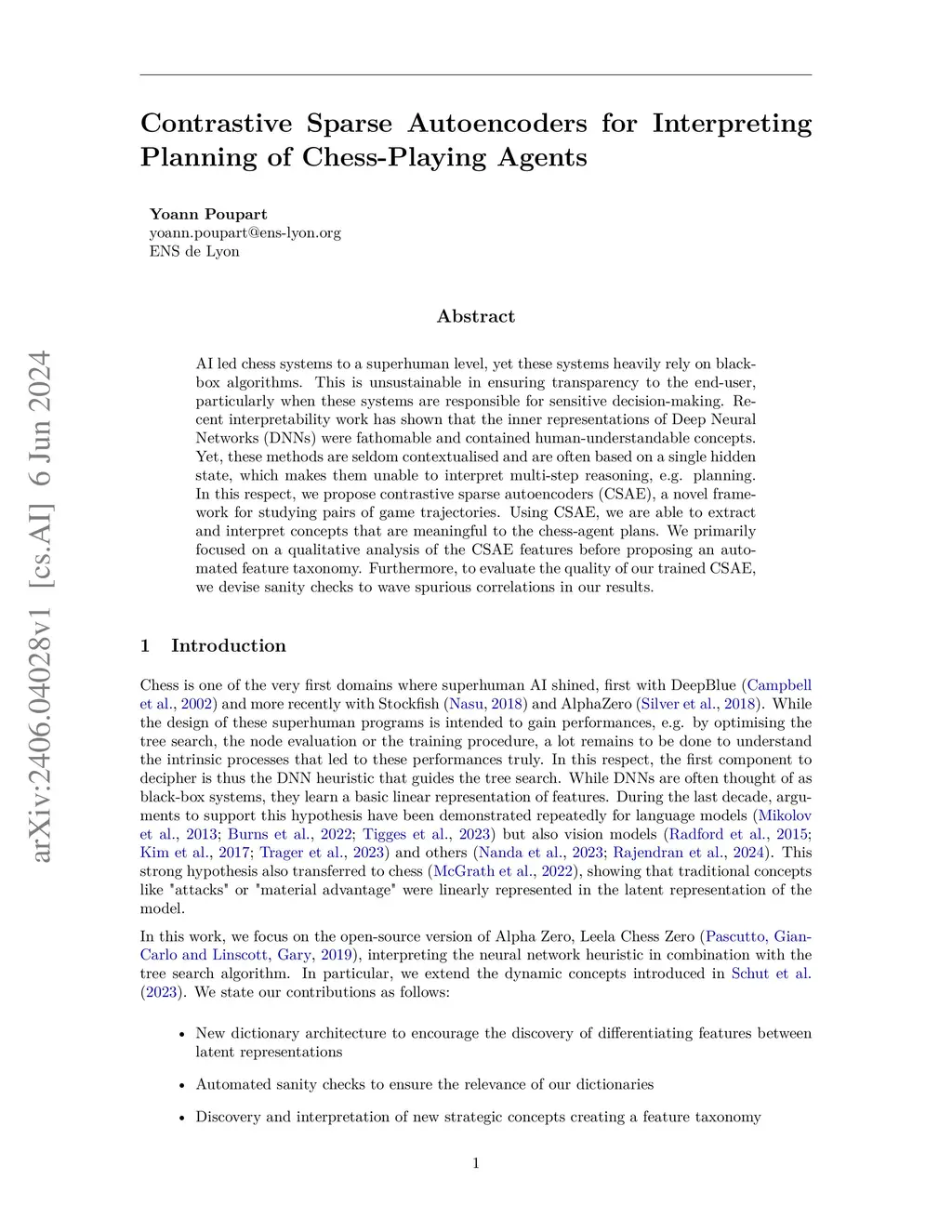 AI led chess systems to a superhuman level, yet these systems heavily rely on black-box algorithms. This is unsustainable in ensuring transparency to the end-user, particularly when these systems are responsible for sensitive decision-making. Recent interpretability work has shown that the inner representations of Deep Neural Networks (DNNs) were fathomable and contained human-understandable concepts. Yet, these methods are seldom contextualised and are often based on a single hidden state, which makes them unable to interpret multi-step reasoning, e.g. planning. In this respect, we propose contrastive sparse autoencoders (CSAE), a novel framework for studying pairs of game trajectories. Using CSAE, we are able to extract and interpret concepts that are meaningful to the chess-agent plans. We primarily focused on a qualitative analysis of the CSAE features before proposing an automated feature taxonomy. Furthermore, to evaluate the quality of our trained CSAE, we devise sanity checks to wave spurious correlations in our results.