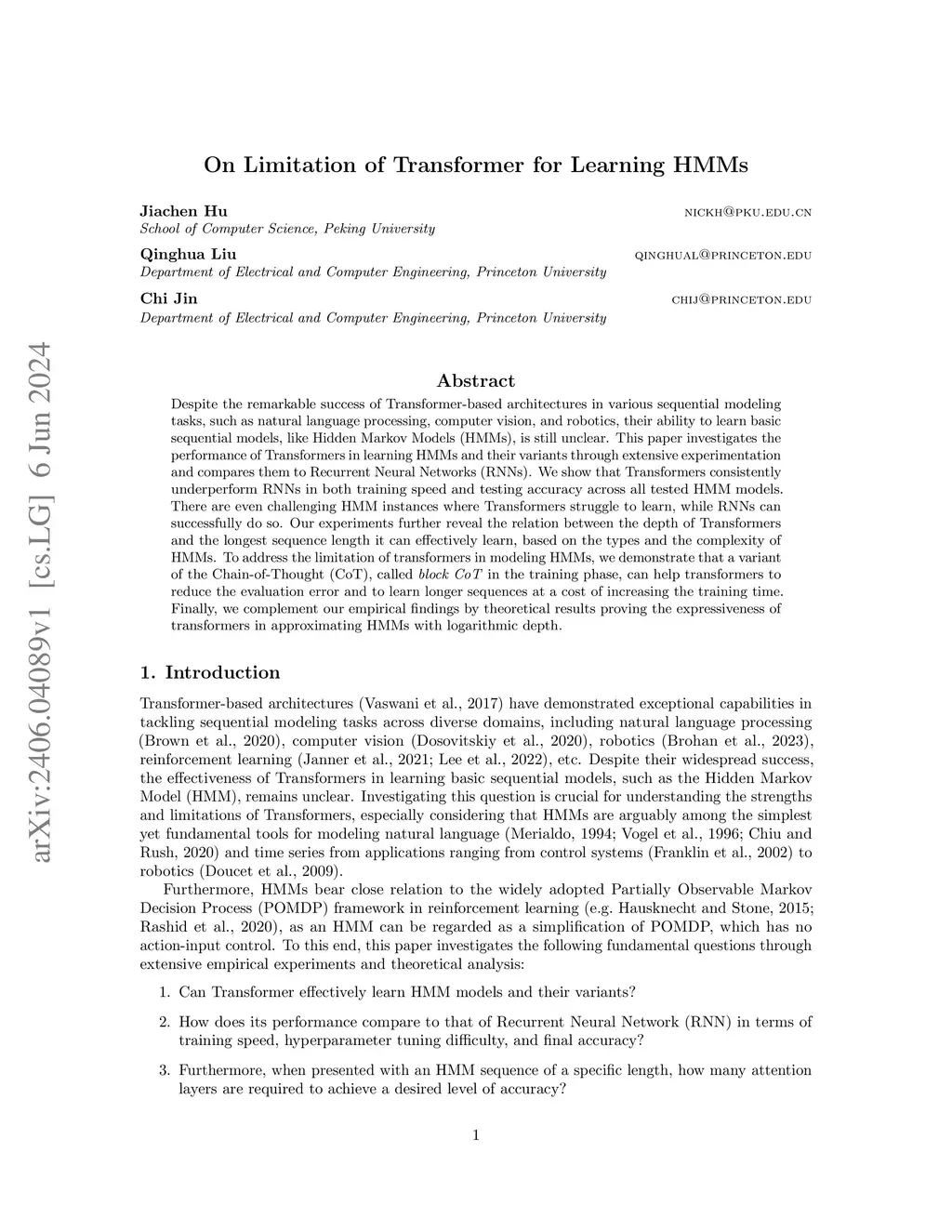 Despite the remarkable success of Transformer-based architectures in various sequential modeling tasks, such as natural language processing, computer vision, and robotics, their ability to learn basic sequential models, like Hidden Markov Models (HMMs), is still unclear. This paper investigates the performance of Transformers in learning HMMs and their variants through extensive experimentation and compares them to Recurrent Neural Networks (RNNs). We show that Transformers consistently underperform RNNs in both training speed and testing accuracy across all tested HMM models. There are even challenging HMM instances where Transformers struggle to learn, while RNNs can successfully do so. Our experiments further reveal the relation between the depth of Transformers and the longest sequence length it can effectively learn, based on the types and the complexity of HMMs. To address the limitation of transformers in modeling HMMs, we demonstrate that a variant of the Chain-of-Thought (CoT), called in the training phase, can help transformers to reduce the evaluation error and to learn longer sequences at a cost of increasing the training time. Finally, we complement our empirical findings by theoretical results proving the expressiveness of transformers in approximating HMMs with logarithmic depth.