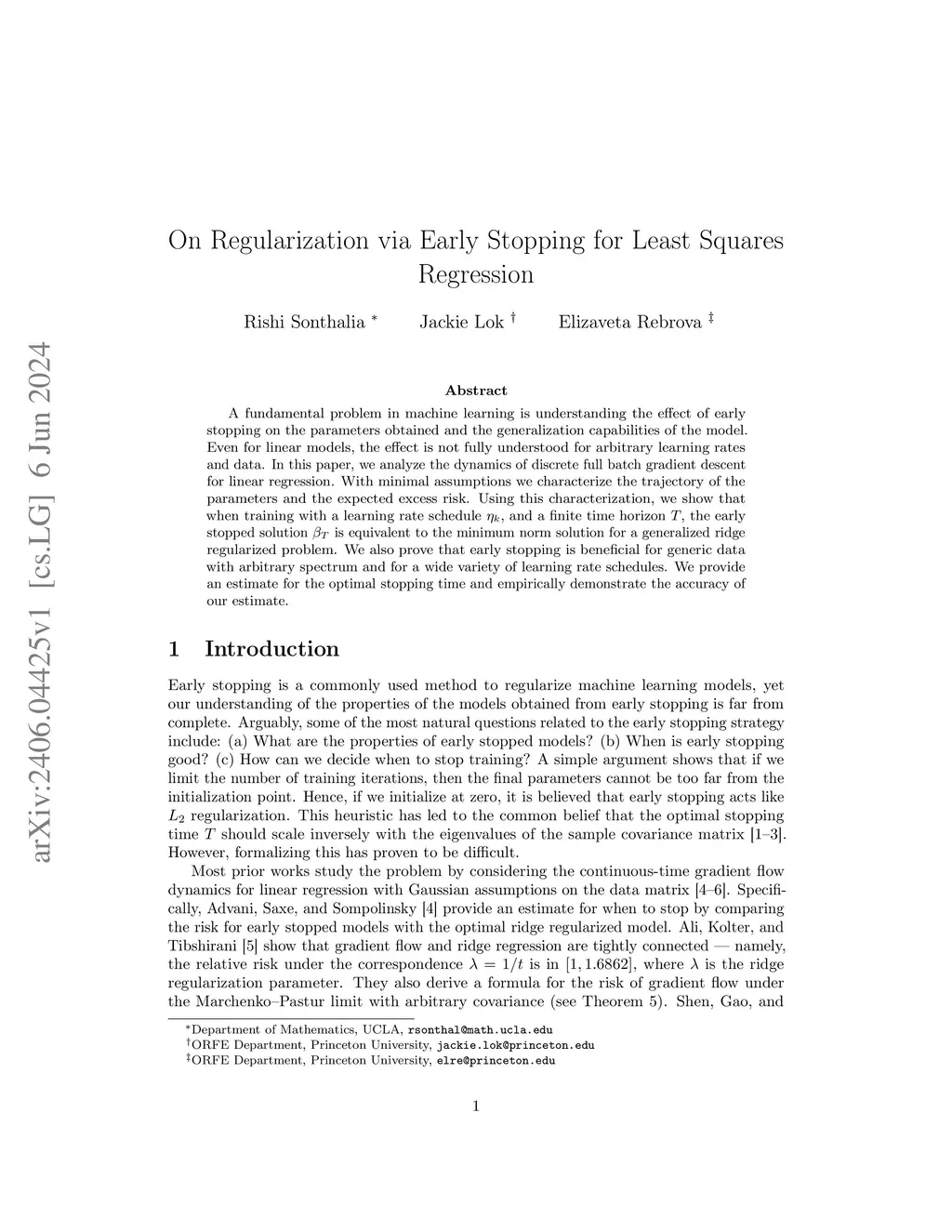 A fundamental problem in machine learning is understanding the effect of early stopping on the parameters obtained and the generalization capabilities of the model. Even for linear models, the effect is not fully understood for arbitrary learning rates and data. In this paper, we analyze the dynamics of discrete full batch gradient descent for linear regression. With minimal assumptions, we characterize the trajectory of the parameters and the expected excess risk. Using this characterization, we show that when training with a learning rate schedule , and a finite time horizon , the early stopped solution is equivalent to the minimum norm solution for a generalized ridge regularized problem. We also prove that early stopping is beneficial for generic data with arbitrary spectrum and for a wide variety of learning rate schedules. We provide an estimate for the optimal stopping time and empirically demonstrate the accuracy of our estimate.