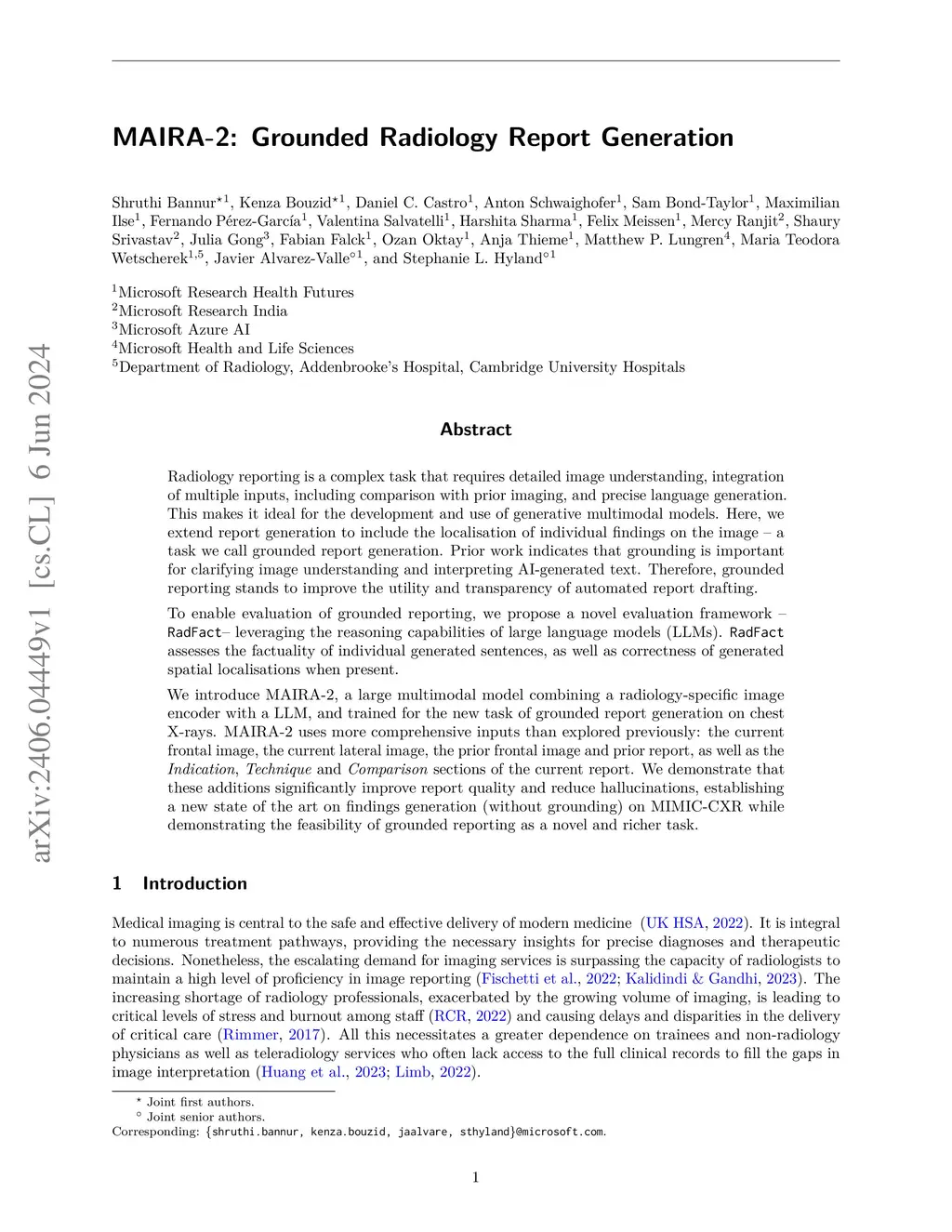 Radiology reporting is a complex task that requires detailed image understanding, integration of multiple inputs, including comparison with prior imaging, and precise language generation. This makes it ideal for the development and use of generative multimodal models. Here, we extend report generation to include the localisation of individual findings on the image - a task we call grounded report generation. Prior work indicates that grounding is important for clarifying image understanding and interpreting AI-generated text. Therefore, grounded reporting stands to improve the utility and transparency of automated report drafting. To enable evaluation of grounded reporting, we propose a novel evaluation framework - RadFact - leveraging the reasoning capabilities of large language models (LLMs). RadFact assesses the factuality of individual generated sentences, as well as correctness of generated spatial localisations when present. We introduce MAIRA-2, a large multimodal model combining a radiology-specific image encoder with a LLM, and trained for the new task of grounded report generation on chest X-rays. MAIRA-2 uses more comprehensive inputs than explored previously: the current frontal image, the current lateral image, the prior frontal image and prior report, as well as the Indication, Technique and Comparison sections of the current report. We demonstrate that these additions significantly improve report quality and reduce hallucinations, establishing a new state of the art on findings generation (without grounding) on MIMIC-CXR while demonstrating the feasibility of grounded reporting as a novel and richer task.