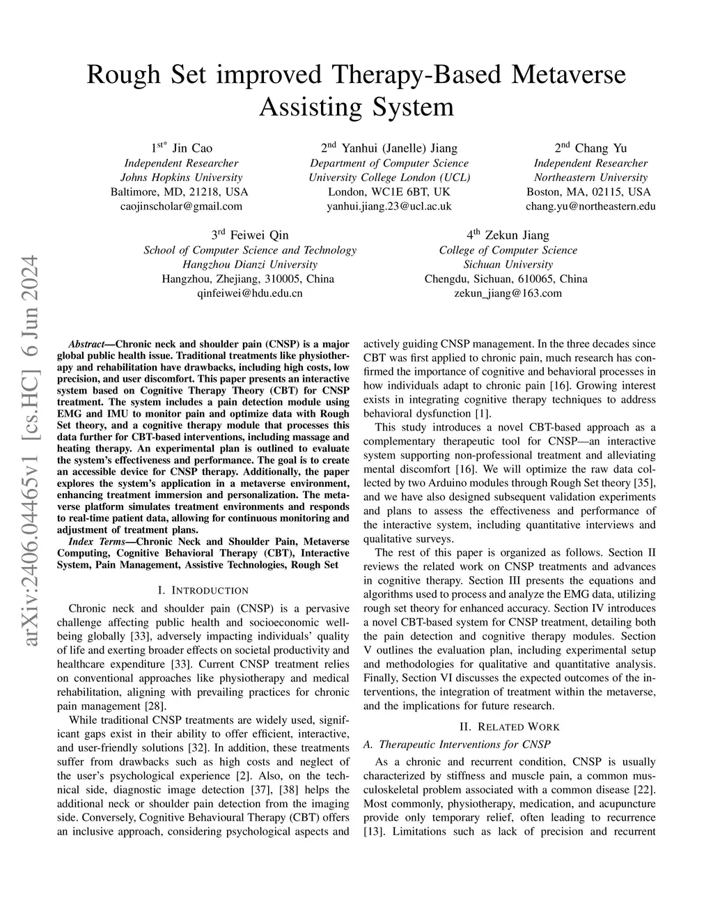 Chronic neck and shoulder pain (CNSP) is a major global public health issue. Traditional treatments like physiotherapy and rehabilitation have drawbacks, including high costs, low precision, and user discomfort. This paper presents an interactive system based on Cognitive Therapy Theory (CBT) for CNSP treatment. The system includes a pain detection module using EMG and IMU to monitor pain and optimize data with Rough Set theory, and a cognitive therapy module that processes this data further for CBT-based interventions, including massage and heating therapy. An experimental plan is outlined to evaluate the system's effectiveness and performance. The goal is to create an accessible device for CNSP therapy. Additionally, the paper explores the system's application in a metaverse environment, enhancing treatment immersion and personalization. The metaverse platform simulates treatment environments and responds to real-time patient data, allowing for continuous monitoring and adjustment of treatment plans.