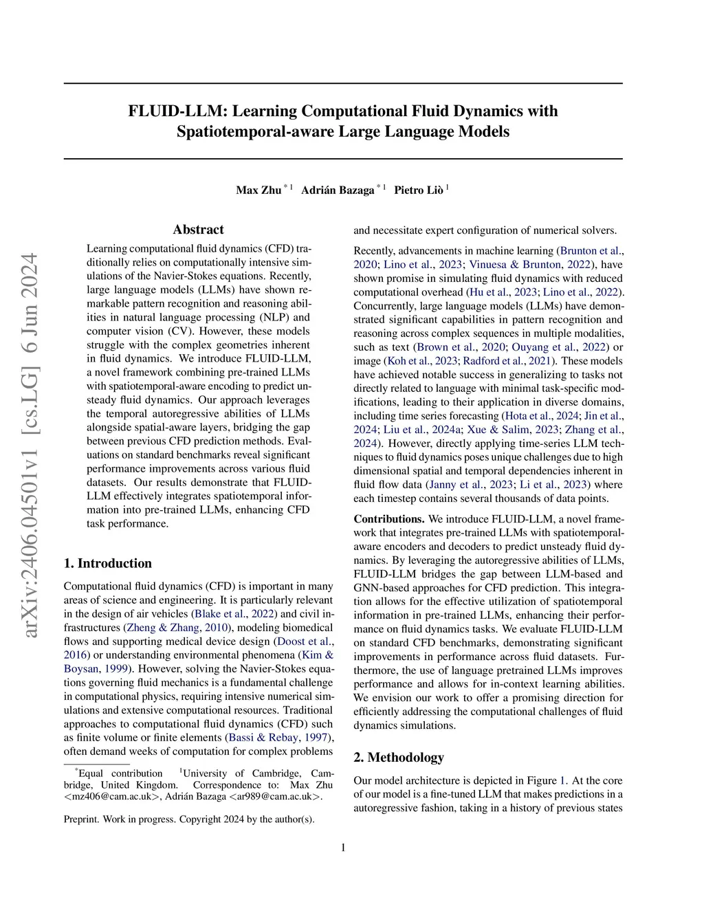 Learning computational fluid dynamics (CFD) traditionally relies on computationally intensive simulations of the Navier-Stokes equations. Recently, large language models (LLMs) have shown remarkable pattern recognition and reasoning abilities in natural language processing (NLP) and computer vision (CV). However, these models struggle with the complex geometries inherent in fluid dynamics. We introduce FLUID-LLM, a novel framework combining pre-trained LLMs with spatiotemporal-aware encoding to predict unsteady fluid dynamics. Our approach leverages the temporal autoregressive abilities of LLMs alongside spatial-aware layers, bridging the gap between previous CFD prediction methods. Evaluations on standard benchmarks reveal significant performance improvements across various fluid datasets. Our results demonstrate that FLUID-LLM effectively integrates spatiotemporal information into pre-trained LLMs, enhancing CFD task performance.