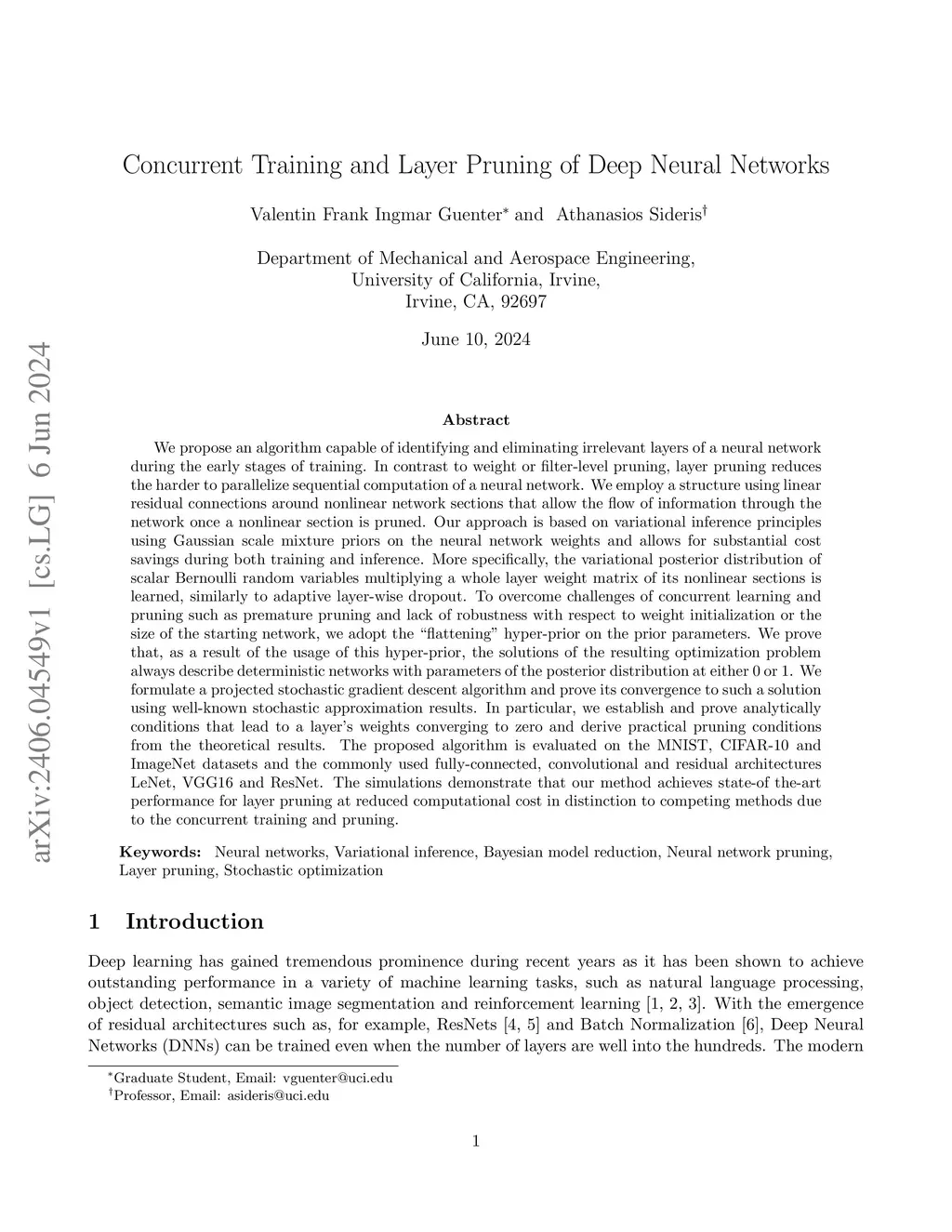 We propose an algorithm capable of identifying and eliminating irrelevant layers of a neural network during the early stages of training. In contrast to weight or filter-level pruning, layer pruning reduces the harder to parallelize sequential computation of a neural network. We employ a structure using residual connections around nonlinear network sections that allow the flow of information through the network once a nonlinear section is pruned. Our approach is based on variational inference principles using Gaussian scale mixture priors on the neural network weights and allows for substantial cost savings during both training and inference. More specifically, the variational posterior distribution of scalar Bernoulli random variables multiplying a layer weight matrix of its nonlinear sections is learned, similarly to adaptive layer-wise dropout. To overcome challenges of concurrent learning and pruning such as premature pruning and lack of robustness with respect to weight initialization or the size of the starting network, we adopt the "flattening" hyper-prior on the prior parameters. We prove that, as a result of its usage, the solutions of the resulting optimization problem describe deterministic networks with parameters of the posterior distribution at either 0 or 1. We formulate a projected SGD algorithm and prove its convergence to such a solution using stochastic approximation results. In particular, we prove conditions that lead to a layer's weights converging to zero and derive practical pruning conditions from the theoretical results. The proposed algorithm is evaluated on the MNIST, CIFAR-10 and ImageNet datasets and common LeNet, VGG16 and ResNet architectures. The simulations demonstrate that our method achieves state-of the-art performance for layer pruning at reduced computational cost in distinction to competing methods due to the concurrent training and pruning.