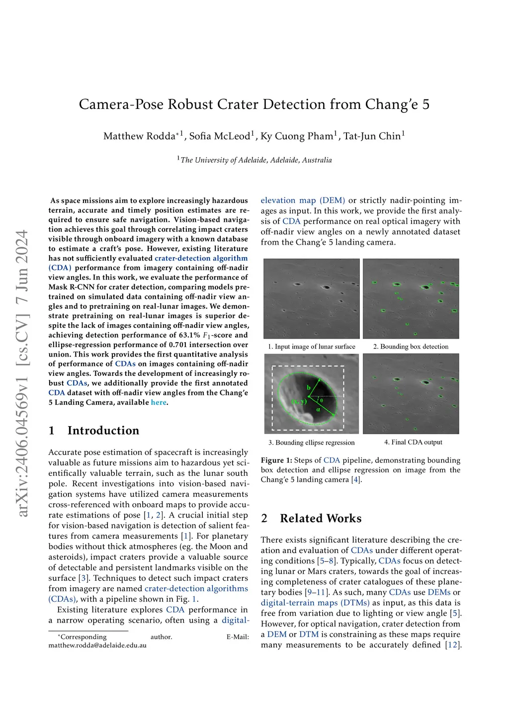 As space missions aim to explore increasingly hazardous terrain, accurate and timely position estimates are required to ensure safe navigation. Vision-based navigation achieves this goal through correlating impact craters visible through onboard imagery with a known database to estimate a craft's pose. However, existing literature has not sufficiently evaluated crater-detection algorithm (CDA) performance from imagery containing off-nadir view angles. In this work, we evaluate the performance of Mask R-CNN for crater detection, comparing models pretrained on simulated data containing off-nadir view angles and to pretraining on real-lunar images. We demonstrate pretraining on real-lunar images is superior despite the lack of images containing off-nadir view angles, achieving detection performance of 63.1 F1-score and ellipse-regression performance of 0.701 intersection over union. This work provides the first quantitative analysis of performance of CDAs on images containing off-nadir view angles. Towards the development of increasingly robust CDAs, we additionally provide the first annotated CDA dataset with off-nadir view angles from the Changé 5 Landing Camera.