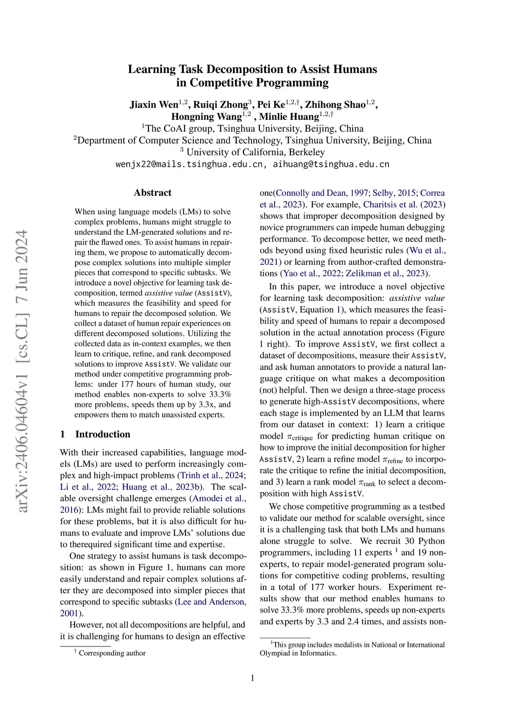 When using language models (LMs) to solve complex problems, humans might struggle to understand the LM-generated solutions and repair the flawed ones. To assist humans in repairing them, we propose to automatically decompose complex solutions into multiple simpler pieces that correspond to specific subtasks. We introduce a novel objective for learning task decomposition, termed assistive value (AssistV), which measures the feasibility and speed for humans to repair the decomposed solution. We collect a dataset of human repair experiences on different decomposed solutions. Utilizing the collected data as in-context examples, we then learn to critique, refine, and rank decomposed solutions to improve AssistV. We validate our method under competitive programming problems: under 177 hours of human study, our method enables non-experts to solve 33.3\% more problems, speeds them up by 3.3x, and empowers them to match unassisted experts.