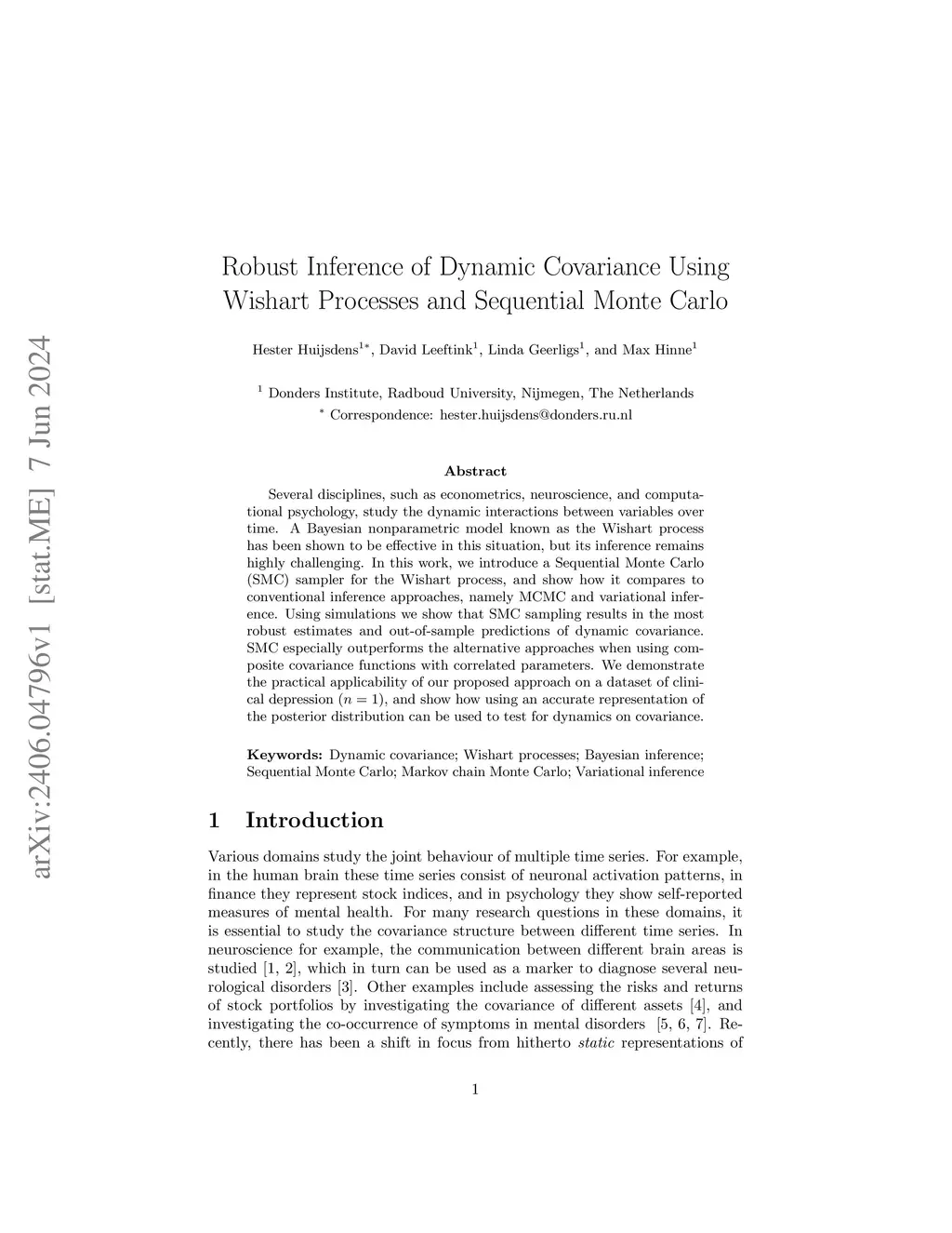 Several disciplines, such as econometrics, neuroscience, and computational psychology, study the dynamic interactions between variables over time. A Bayesian nonparametric model known as the Wishart process has been shown to be effective in this situation, but its inference remains highly challenging. In this work, we introduce a Sequential Monte Carlo (SMC) sampler for the Wishart process, and show how it compares to conventional inference approaches, namely MCMC and variational inference. Using simulations we show that SMC sampling results in the most robust estimates and out-of-sample predictions of dynamic covariance. SMC especially outperforms the alternative approaches when using composite covariance functions with correlated parameters. We demonstrate the practical applicability of our proposed approach on a dataset of clinical depression (n=1), and show how using an accurate representation of the posterior distribution can be used to test for dynamics on covariance