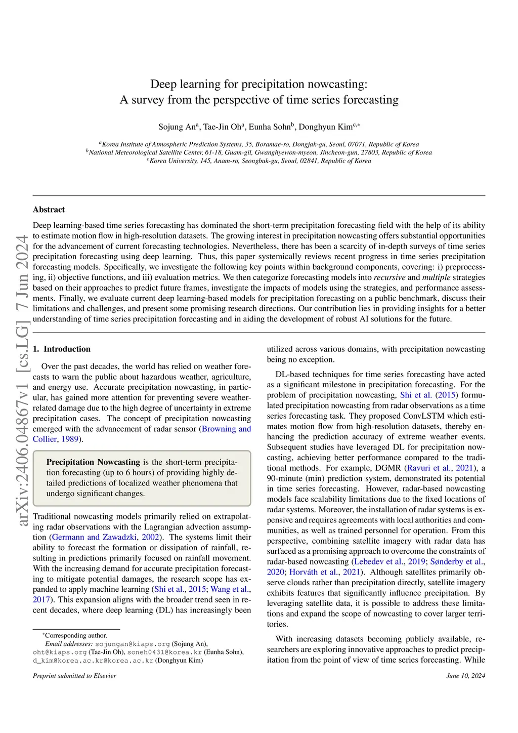 Deep learning-based time series forecasting has dominated the short-term precipitation forecasting field with the help of its ability to estimate motion flow in high-resolution datasets. The growing interest in precipitation nowcasting offers substantial opportunities for the advancement of current forecasting technologies. Nevertheless, there has been a scarcity of in-depth surveys of time series precipitation forecasting using deep learning. Thus, this paper systemically reviews recent progress in time series precipitation forecasting models. Specifically, we investigate the following key points within background components, covering: i) preprocessing, ii) objective functions, and iii) evaluation metrics. We then categorize forecasting models into \textit{recursive} and \textit{multiple} strategies based on their approaches to predict future frames, investigate the impacts of models using the strategies, and performance assessments. Finally, we evaluate current deep learning-based models for precipitation forecasting on a public benchmark, discuss their limitations and challenges, and present some promising research directions. Our contribution lies in providing insights for a better understanding of time series precipitation forecasting and in aiding the development of robust AI solutions for the future.