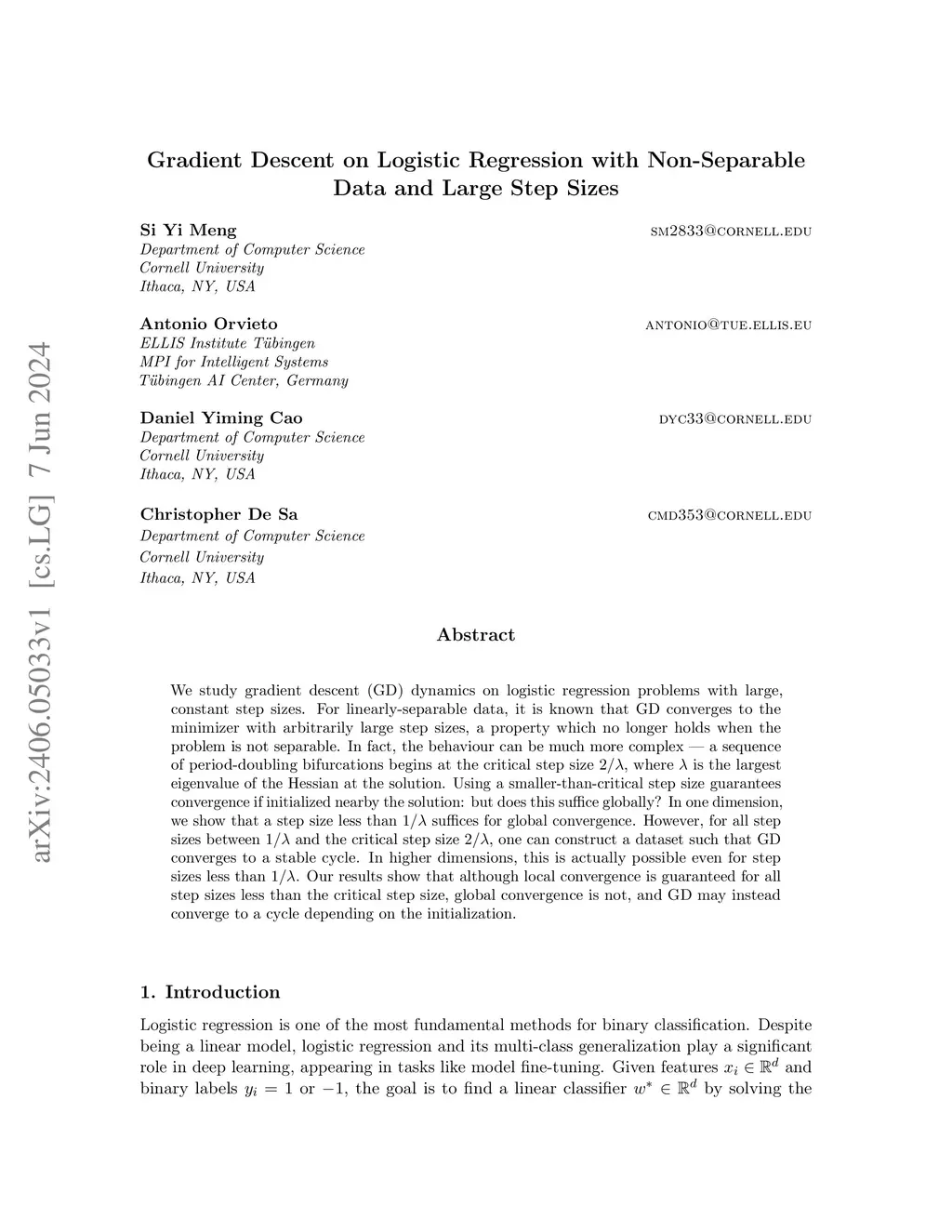 We study gradient descent (GD) dynamics on logistic regression problems with large, constant step sizes. For linearly-separable data, it is known that GD converges to the minimizer with arbitrarily large step sizes, a property which no longer holds when the problem is not separable. In fact, the behaviour can be much more complex -- a sequence of period-doubling bifurcations begins at the critical step size , where is the largest eigenvalue of the Hessian at the solution. Using a smaller-than-critical step size guarantees convergence if initialized nearby the solution: but does this suffice globally? In one dimension, we show that a step size less than suffices for global convergence. However, for all step sizes between and the critical step size , one can construct a dataset such that GD converges to a stable cycle. In higher dimensions, this is actually possible even for step sizes less than . Our results show that although local convergence is guaranteed for all step sizes less than the critical step size, global convergence is not, and GD may instead converge to a cycle depending on the initialization.