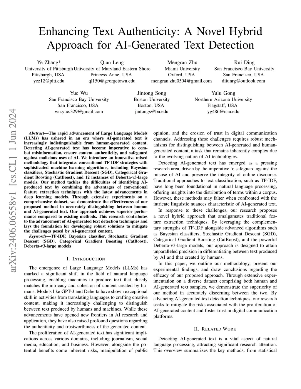 The rapid advancement of Large Language Models (LLMs) has ushered in an era where AI-generated text is increasingly indistinguishable from human-generated content. Detecting AI-generated text has become imperative to combat misinformation, ensure content authenticity, and safeguard against malicious uses of AI. In this paper, we propose a novel hybrid approach that combines traditional TF-IDF techniques with advanced machine learning models, including Bayesian classifiers, Stochastic Gradient Descent (SGD), Categorical Gradient Boosting (CatBoost), and 12 instances of Deberta-v3-large models. Our approach aims to address the challenges associated with detecting AI-generated text by leveraging the strengths of both traditional feature extraction methods and state-of-the-art deep learning models. Through extensive experiments on a comprehensive dataset, we demonstrate the effectiveness of our proposed method in accurately distinguishing between human and AI-generated text. Our approach achieves superior performance compared to existing methods. This research contributes to the advancement of AI-generated text detection techniques and lays the foundation for developing robust solutions to mitigate the challenges posed by AI-generated content.