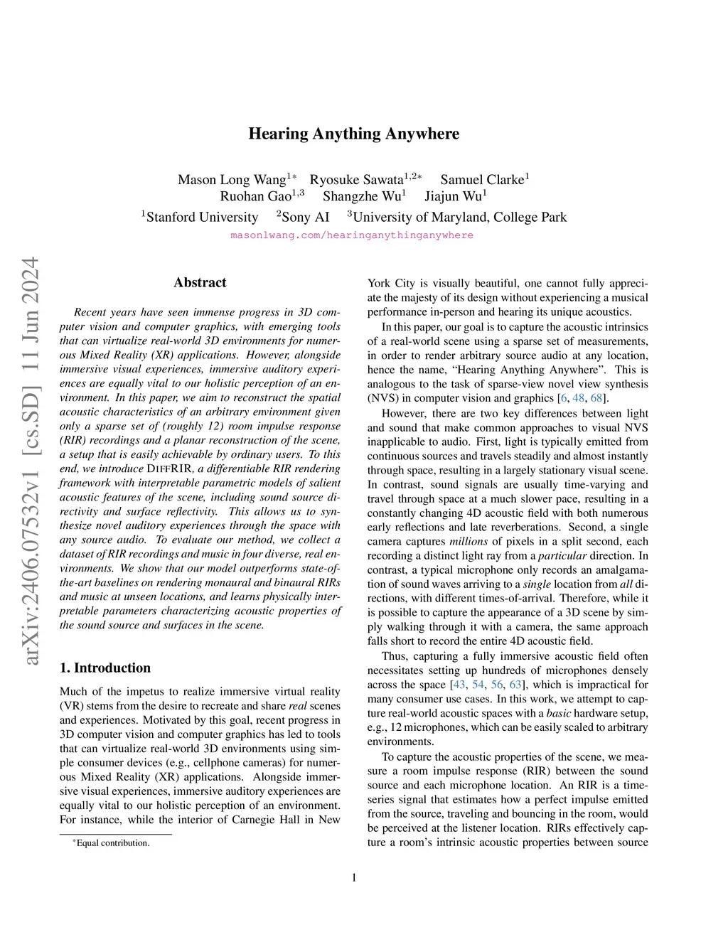 Recent years have seen immense progress in 3D computer vision and computer graphics, with emerging tools that can virtualize real-world 3D environments for numerous Mixed Reality (XR) applications. However, alongside immersive visual experiences, immersive auditory experiences are equally vital to our holistic perception of an environment. In this paper, we aim to reconstruct the spatial acoustic characteristics of an arbitrary environment given only a sparse set of (roughly 12) room impulse response (RIR) recordings and a planar reconstruction of the scene, a setup that is easily achievable by ordinary users. To this end, we introduce DiffRIR, a differentiable RIR rendering framework with interpretable parametric models of salient acoustic features of the scene, including sound source directivity and surface reflectivity. This allows us to synthesize novel auditory experiences through the space with any source audio. To evaluate our method, we collect a dataset of RIR recordings and music in four diverse, real environments. We show that our model outperforms state-ofthe-art baselines on rendering monaural and binaural RIRs and music at unseen locations, and learns physically interpretable parameters characterizing acoustic properties of the sound source and surfaces in the scene.