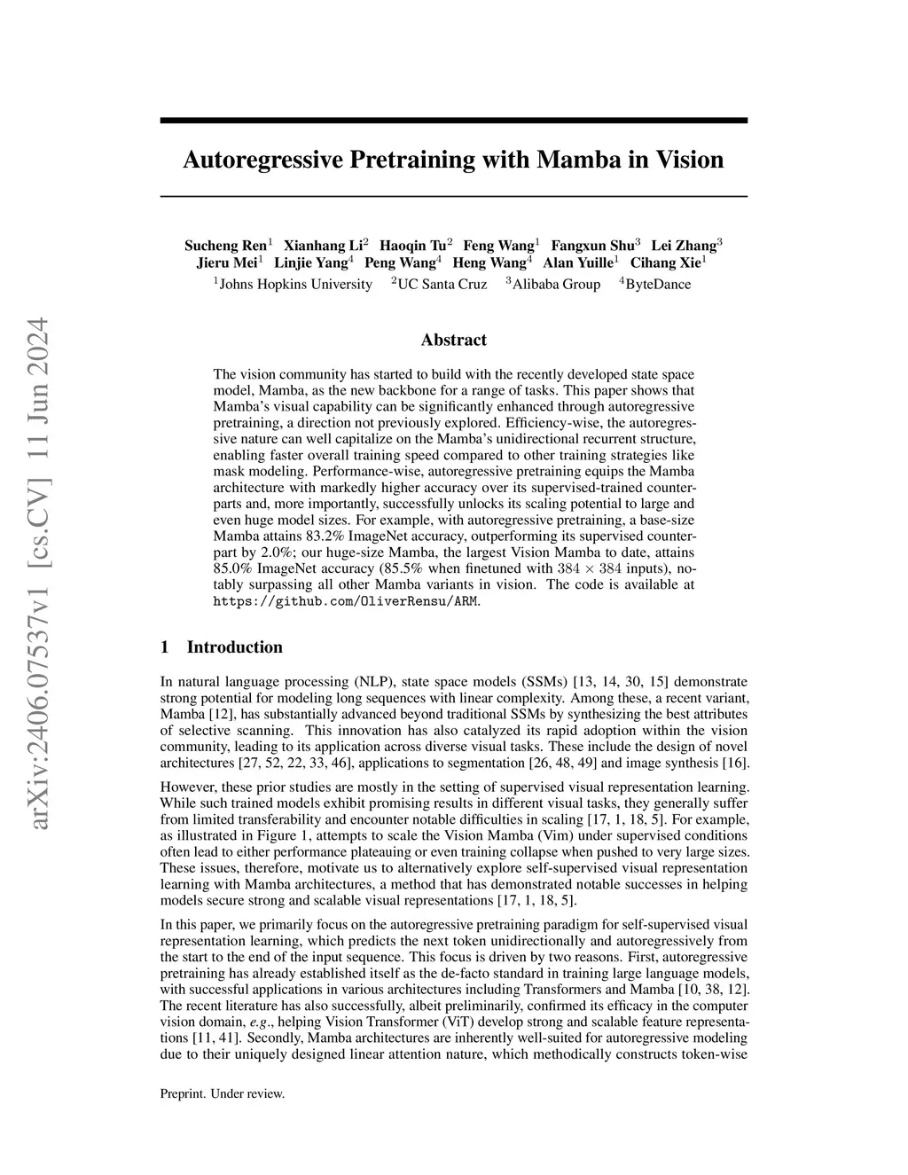 The vision community has started to build with the recently developed state space model, Mamba, as the new backbone for a range of tasks. This paper shows that Mamba's visual capability can be significantly enhanced through autoregressive pretraining, a direction not previously explored. Efficiency-wise, the autoregressive nature can well capitalize on the Mamba's unidirectional recurrent structure, enabling faster overall training speed compared to other training strategies like mask modeling. Performance-wise, autoregressive pretraining equips the Mamba architecture with markedly higher accuracy over its supervised-trained counterparts and, more importantly, successfully unlocks its scaling potential to large and even huge model sizes. For example, with autoregressive pretraining, a base-size Mamba attains 83.2\% ImageNet accuracy, outperforming its supervised counterpart by 2.0\%; our huge-size Mamba, the largest Vision Mamba to date, attains 85.0\% ImageNet accuracy (85.5\% when finetuned with inputs), notably surpassing all other Mamba variants in vision. The code is available at \url{https://github.com/OliverRensu/ARM}.