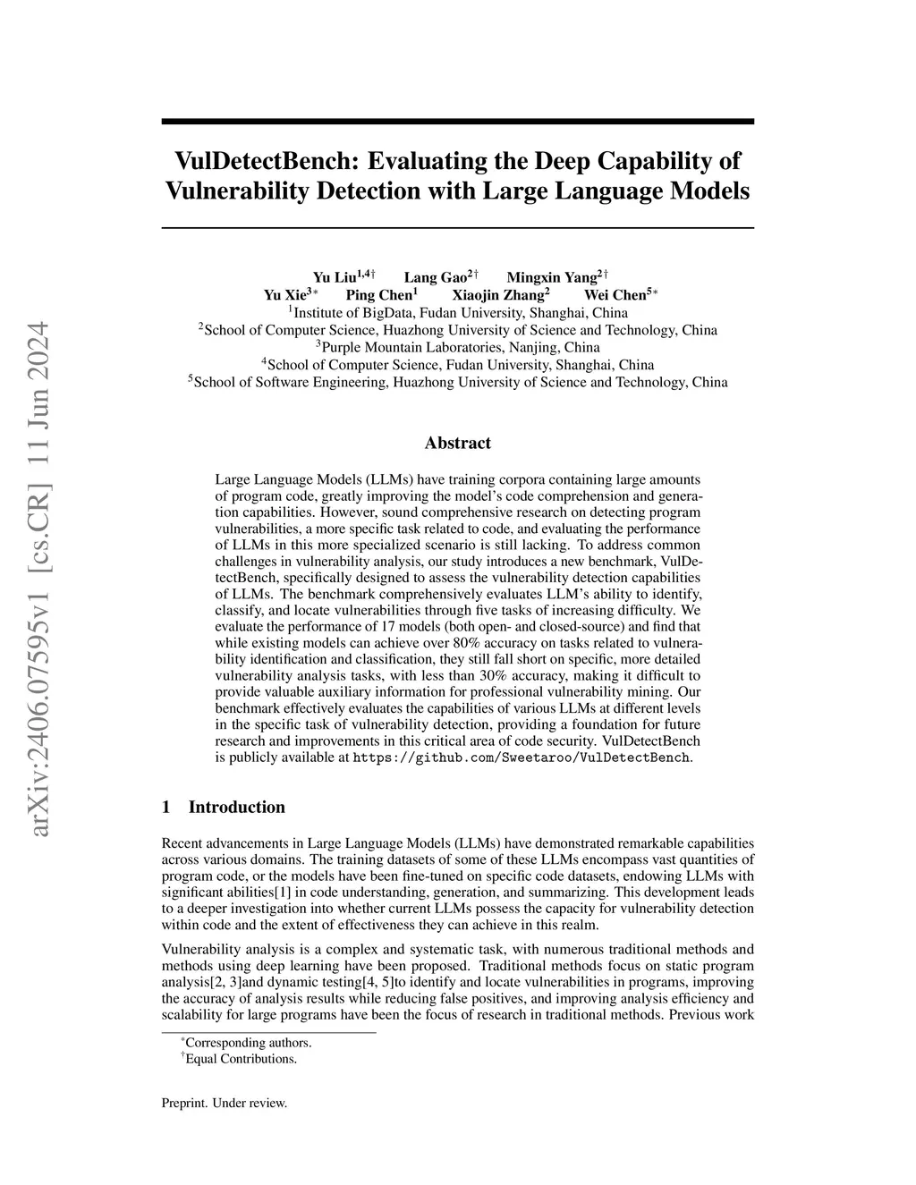 Large Language Models (LLMs) have training corpora containing large amounts of program code, greatly improving the model's code comprehension and generation capabilities. However, sound comprehensive research on detecting program vulnerabilities, a more specific task related to code, and evaluating the performance of LLMs in this more specialized scenario is still lacking. To address common challenges in vulnerability analysis, our study introduces a new benchmark, VulDetectBench, specifically designed to assess the vulnerability detection capabilities of LLMs. The benchmark comprehensively evaluates LLM's ability to identify, classify, and locate vulnerabilities through five tasks of increasing difficulty. We evaluate the performance of 17 models (both open- and closed-source) and find that while existing models can achieve over 80% accuracy on tasks related to vulnerability identification and classification, they still fall short on specific, more detailed vulnerability analysis tasks, with less than 30% accuracy, making it difficult to provide valuable auxiliary information for professional vulnerability mining. Our benchmark effectively evaluates the capabilities of various LLMs at different levels in the specific task of vulnerability detection, providing a foundation for future research and improvements in this critical area of code security. VulDetectBench is publicly available at https://github.com/Sweetaroo/VulDetectBench.