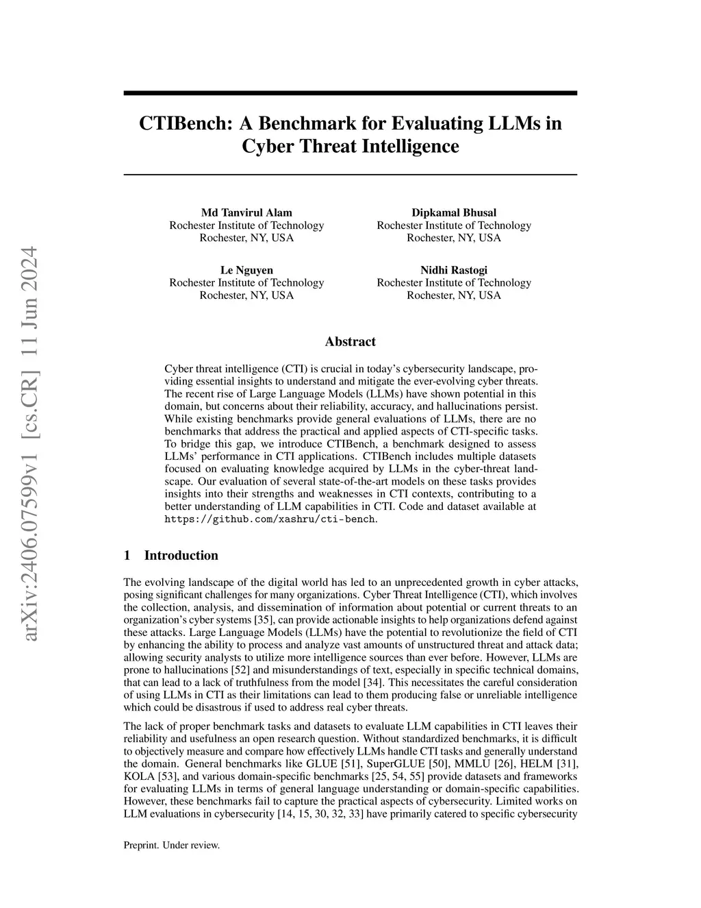 Cyber threat intelligence (CTI) is crucial in today's cybersecurity landscape, providing essential insights to understand and mitigate the ever-evolving cyber threats. The recent rise of Large Language Models (LLMs) have shown potential in this domain, but concerns about their reliability, accuracy, and hallucinations persist. While existing benchmarks provide general evaluations of LLMs, there are no benchmarks that address the practical and applied aspects of CTI-specific tasks. To bridge this gap, we introduce CTIBench, a benchmark designed to assess LLMs' performance in CTI applications. CTIBench includes multiple datasets focused on evaluating knowledge acquired by LLMs in the cyber-threat landscape. Our evaluation of several state-of-the-art models on these tasks provides insights into their strengths and weaknesses in CTI contexts, contributing to a better understanding of LLM capabilities in CTI.