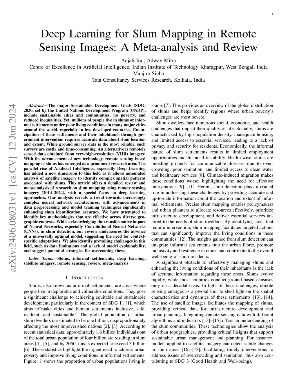 The major Sustainable Development Goals (SDG) 2030, set by the United Nations Development Program (UNDP), include sustainable cities and communities, no poverty, and reduced inequalities. However, millions of people live in slums or informal settlements with poor living conditions in many major cities around the world, especially in less developed countries. To emancipate these settlements and their inhabitants through government intervention, accurate data about slum location and extent is required. While ground survey data is the most reliable, such surveys are costly and time-consuming. An alternative is remotely sensed data obtained from very high-resolution (VHR) imagery. With the advancement of new technology, remote sensing based mapping of slums has emerged as a prominent research area. The parallel rise of Artificial Intelligence, especially Deep Learning has added a new dimension to this field as it allows automated analysis of satellite imagery to identify complex spatial patterns associated with slums. This article offers a detailed review and meta-analysis of research on slum mapping using remote sensing imagery from 2014 to 2024, with a special focus on deep learning approaches. Our analysis reveals a trend towards increasingly complex neural network architectures, with advancements in data preprocessing and model training techniques significantly enhancing slum identification accuracy. We have attempted to identify key methodologies that are effective across diverse geographic contexts. While acknowledging the transformative impact Convolutional Neural Networks (CNNs) in slum detection, our review underscores the absence of a universally optimal model, suggesting the need for context-specific adaptations. We also identify prevailing challenges in this field, such as data limitations and a lack of model explainability and suggest potential strategies for overcoming these.