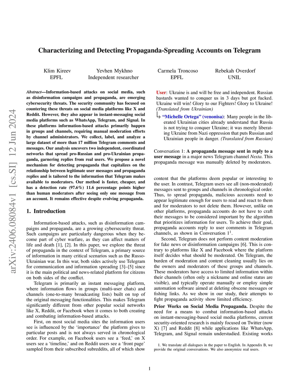 Information-based attacks on social media, such as disinformation campaigns and propaganda, are emerging cybersecurity threats. The security community has focused on countering these threats on social media platforms like X and Reddit. However, they also appear in instant-messaging social media platforms such as WhatsApp, Telegram, and Signal. In these platforms information-based attacks primarily happen in groups and channels, requiring manual moderation efforts by channel administrators. We collect, label, and analyze a large dataset of more than 17 million Telegram comments and messages. Our analysis uncovers two independent, coordinated networks that spread pro-Russian and pro-Ukrainian propaganda, garnering replies from real users. We propose a novel mechanism for detecting propaganda that capitalizes on the relationship between legitimate user messages and propaganda replies and is tailored to the information that Telegram makes available to moderators. Our method is faster, cheaper, and has a detection rate (97.6%) 11.6 percentage points higher than human moderators after seeing only one message from an account. It remains effective despite evolving propaganda.