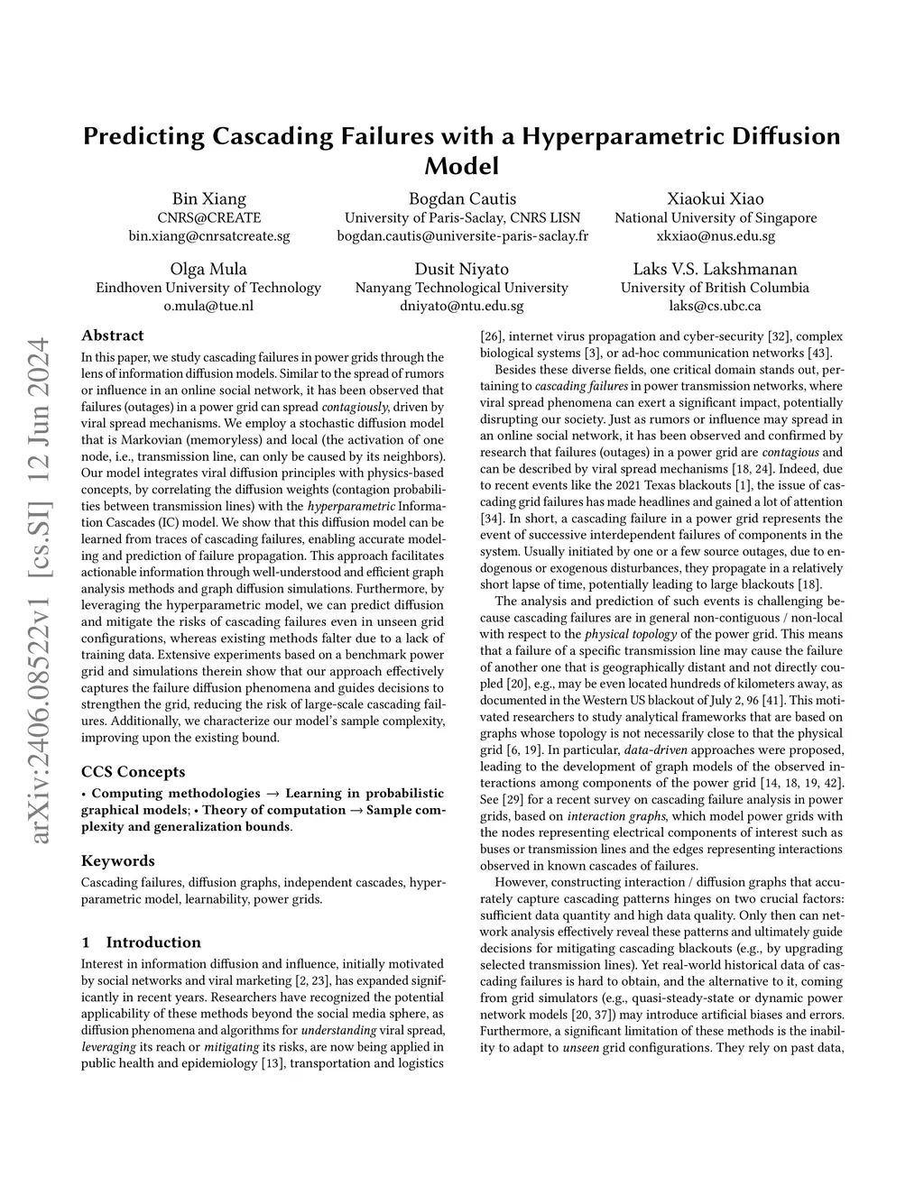 In this paper, we study cascading failures in power grids through the lens of information diffusion models. Similar to the spread of rumors or influence in an online social network, it has been observed that failures (outages) in a power grid can spread contagiously, driven by viral spread mechanisms. We employ a stochastic diffusion model that is Markovian (memoryless) and local (the activation of one node, i.e., transmission line, can only be caused by its neighbors). Our model integrates viral diffusion principles with physics-based concepts, by correlating the diffusion weights (contagion probabilities between transmission lines) with the hyperparametric Information Cascades (IC) model. We show that this diffusion model can be learned from traces of cascading failures, enabling accurate modeling and prediction of failure propagation. This approach facilitates actionable information through well-understood and efficient graph analysis methods and graph diffusion simulations. Furthermore, by leveraging the hyperparametric model, we can predict diffusion and mitigate the risks of cascading failures even in unseen grid configurations, whereas existing methods falter due to a lack of training data. Extensive experiments based on a benchmark power grid and simulations therein show that our approach effectively captures the failure diffusion phenomena and guides decisions to strengthen the grid, reducing the risk of large-scale cascading failures. Additionally, we characterize our model's sample complexity, improving upon the existing bound.