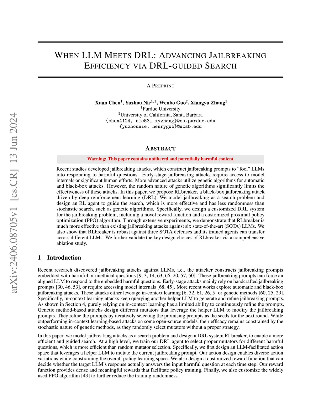 Recent studies developed jailbreaking attacks, which construct jailbreaking prompts to fool LLMs into responding to harmful questions. Early-stage jailbreaking attacks require access to model internals or significant human efforts. More advanced attacks utilize genetic algorithms for automatic and black-box attacks. However, the random nature of genetic algorithms significantly limits the effectiveness of these attacks. In this paper, we propose RLbreaker, a black-box jailbreaking attack driven by deep reinforcement learning (DRL). We model jailbreaking as a search problem and design an RL agent to guide the search, which is more effective and has less randomness than stochastic search, such as genetic algorithms. Specifically, we design a customized DRL system for the jailbreaking problem, including a novel reward function and a customized proximal policy optimization (PPO) algorithm. Through extensive experiments, we demonstrate that RLbreaker is much more effective than existing jailbreaking attacks against six state-of-the-art (SOTA) LLMs. We also show that RLbreaker is robust against three SOTA defenses and its trained agents can transfer across different LLMs. We further validate the key design choices of RLbreaker via a comprehensive ablation study.