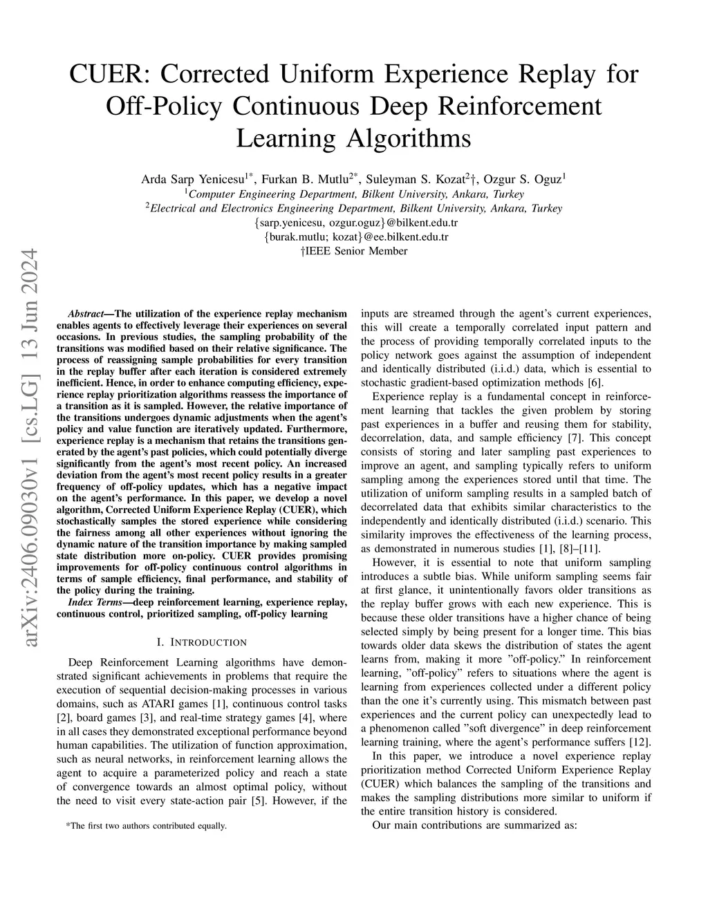 The utilization of the experience replay mechanism enables agents to effectively leverage their experiences on several occasions. In previous studies, the sampling probability of the transitions was modified based on their relative significance. The process of reassigning sample probabilities for every transition in the replay buffer after each iteration is considered extremely inefficient. Hence, in order to enhance computing efficiency, experience replay prioritization algorithms reassess the importance of a transition as it is sampled. However, the relative importance of the transitions undergoes dynamic adjustments when the agent's policy and value function are iteratively updated. Furthermore, experience replay is a mechanism that retains the transitions generated by the agent's past policies, which could potentially diverge significantly from the agent's most recent policy. An increased deviation from the agent's most recent policy results in a greater frequency of off-policy updates, which has a negative impact on the agent's performance. In this paper, we develop a novel algorithm, Corrected Uniform Experience Replay (CUER), which stochastically samples the stored experience while considering the fairness among all other experiences without ignoring the dynamic nature of the transition importance by making sampled state distribution more on-policy. CUER provides promising improvements for off-policy continuous control algorithms in terms of sample efficiency, final performance, and stability of the policy during the training.