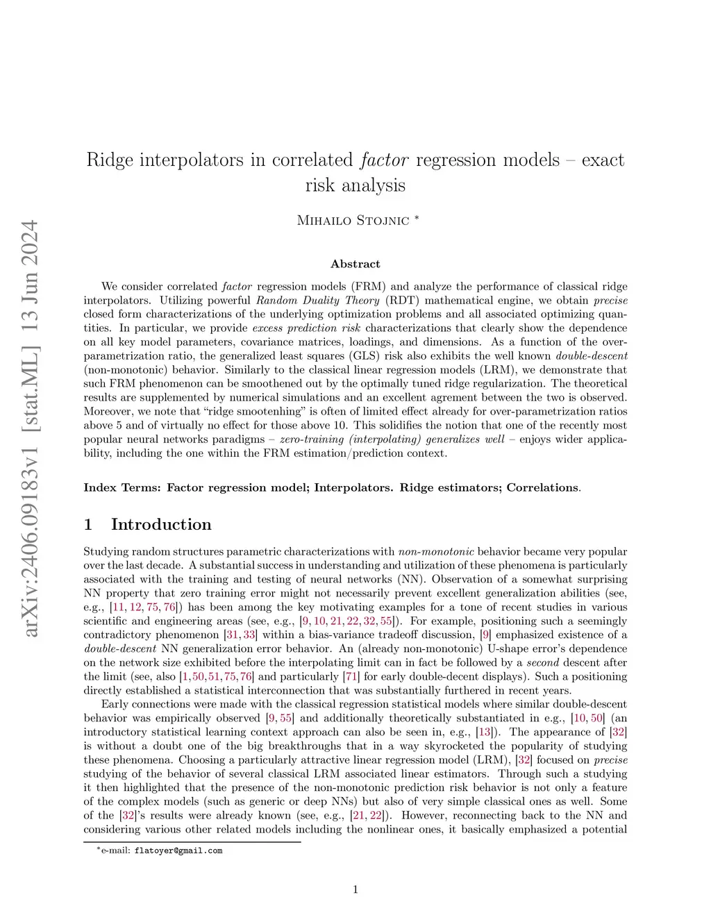 We consider correlated \emph{factor} regression models (FRM) and analyze the performance of classical ridge interpolators. Utilizing powerful \emph{Random Duality Theory} (RDT) mathematical engine, we obtain \emph{precise} closed form characterizations of the underlying optimization problems and all associated optimizing quantities. In particular, we provide \emph{excess prediction risk} characterizations that clearly show the dependence on all key model parameters, covariance matrices, loadings, and dimensions. As a function of the over-parametrization ratio, the generalized least squares (GLS) risk also exhibits the well known \emph{double-descent} (non-monotonic) behavior. Similarly to the classical linear regression models (LRM), we demonstrate that such FRM phenomenon can be smoothened out by the optimally tuned ridge regularization. The theoretical results are supplemented by numerical simulations and an excellent agrement between the two is observed. Moreover, we note that ``ridge smootenhing'' is often of limited effect already for over-parametrization ratios above and of virtually no effect for those above . This solidifies the notion that one of the recently most popular neural networks paradigms -- \emph{zero-training (interpolating) generalizes well} -- enjoys wider applicability, including the one within the FRM estimation/prediction context.