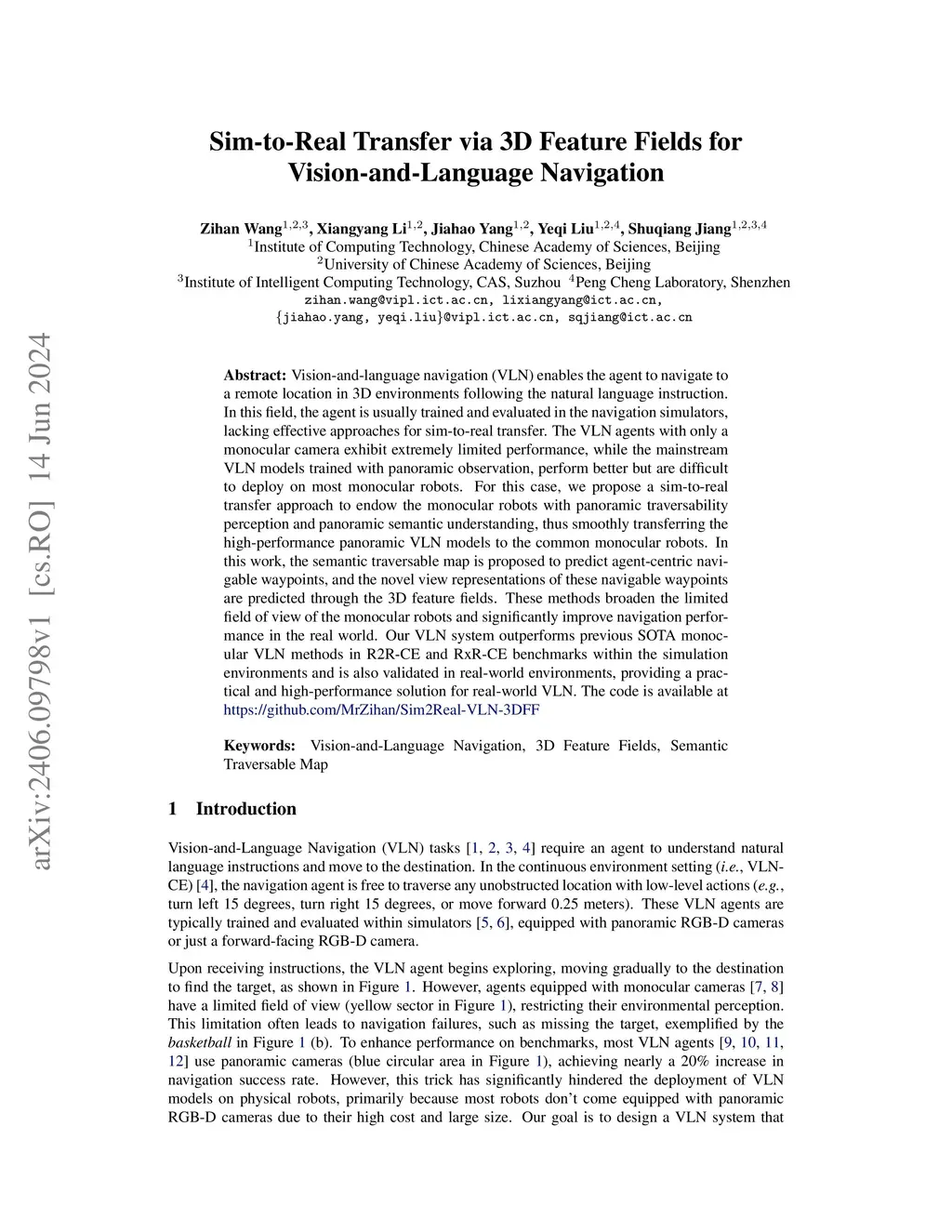 Vision-and-language navigation (VLN) enables the agent to navigate to a remote location in 3D environments following the natural language instruction. In this field, the agent is usually trained and evaluated in the navigation simulators, lacking effective approaches for sim-to-real transfer. The VLN agents with only a monocular camera exhibit extremely limited performance, while the mainstream VLN models trained with panoramic observation, perform better but are difficult to deploy on most monocular robots. For this case, we propose a sim-to-real transfer approach to endow the monocular robots with panoramic traversability perception and panoramic semantic understanding, thus smoothly transferring the high-performance panoramic VLN models to the common monocular robots. In this work, the semantic traversable map is proposed to predict agent-centric navigable waypoints, and the novel view representations of these navigable waypoints are predicted through the 3D feature fields. These methods broaden the limited field of view of the monocular robots and significantly improve navigation performance in the real world. Our VLN system outperforms previous SOTA monocular VLN methods in R2R-CE and RxR-CE benchmarks within the simulation environments and is also validated in real-world environments, providing a practical and high-performance solution for real-world VLN.