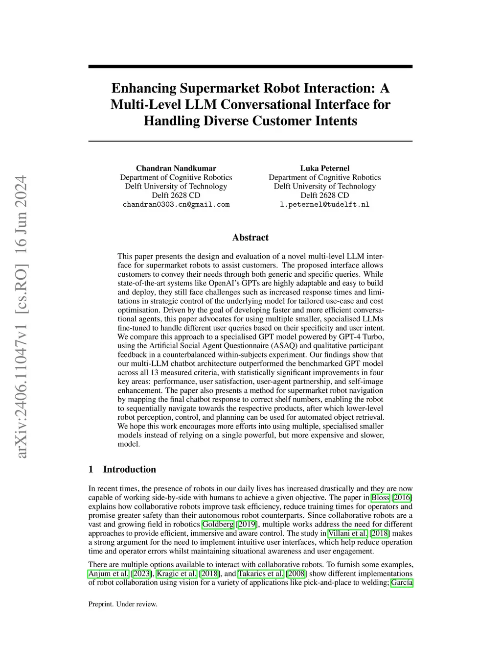 This paper presents the design and evaluation of a novel multi-level LLM interface for supermarket robots to assist customers. The proposed interface allows customers to convey their needs through both generic and specific queries. While state-of-the-art systems like OpenAI's GPTs are highly adaptable and easy to build and deploy, they still face challenges such as increased response times and limitations in strategic control of the underlying model for tailored use-case and cost optimization. Driven by the goal of developing faster and more efficient conversational agents, this paper advocates for using multiple smaller, specialized LLMs fine-tuned to handle different user queries based on their specificity and user intent. We compare this approach to a specialized GPT model powered by GPT-4 Turbo, using the Artificial Social Agent Questionnaire (ASAQ) and qualitative participant feedback in a counterbalanced within-subjects experiment. Our findings show that our multi-LLM chatbot architecture outperformed the benchmarked GPT model across all 13 measured criteria, with statistically significant improvements in four key areas: performance, user satisfaction, user-agent partnership, and self-image enhancement. The paper also presents a method for supermarket robot navigation by mapping the final chatbot response to correct shelf numbers, enabling the robot to sequentially navigate towards the respective products, after which lower-level robot perception, control, and planning can be used for automated object retrieval. We hope this work encourages more efforts into using multiple, specialized smaller models instead of relying on a single powerful, but more expensive and slower model.