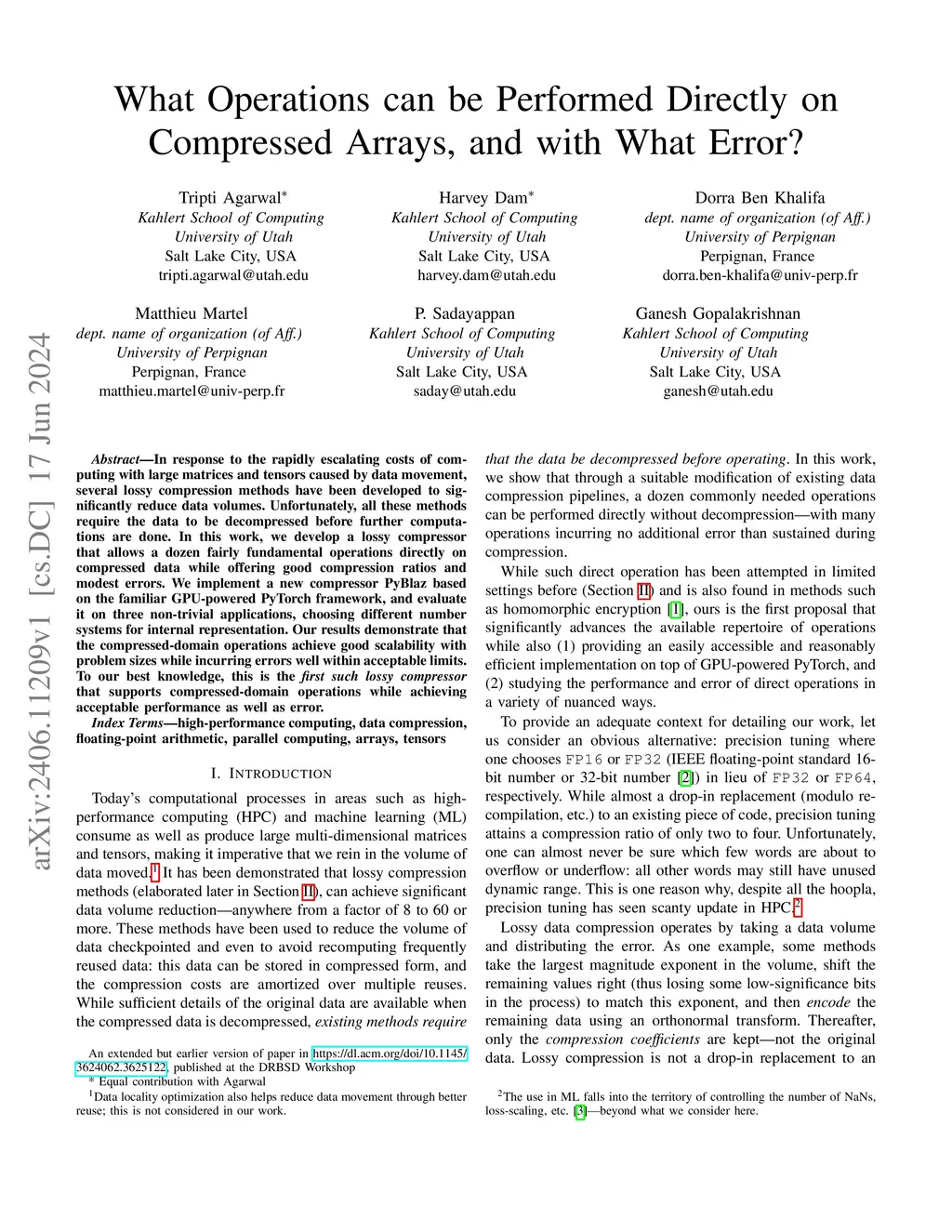 In response to the rapidly escalating costs of computing with large matrices and tensors caused by data movement, several lossy compression methods have been developed to significantly reduce data volumes. Unfortunately, all these methods require the data to be decompressed before further computations are done. In this work, we develop a lossy compressor that allows a dozen fairly fundamental operations directly on compressed data while offering good compression ratios and modest errors. We implement a new compressor PyBlaz based on the familiar GPU-powered PyTorch framework, and evaluate it on three non-trivial applications, choosing different number systems for internal representation. Our results demonstrate that the compressed-domain operations achieve good scalability with problem sizes while incurring errors well within acceptable limits. To our best knowledge, this is the first such lossy compressor that supports compressed-domain operations while achieving acceptable performance as well as error.