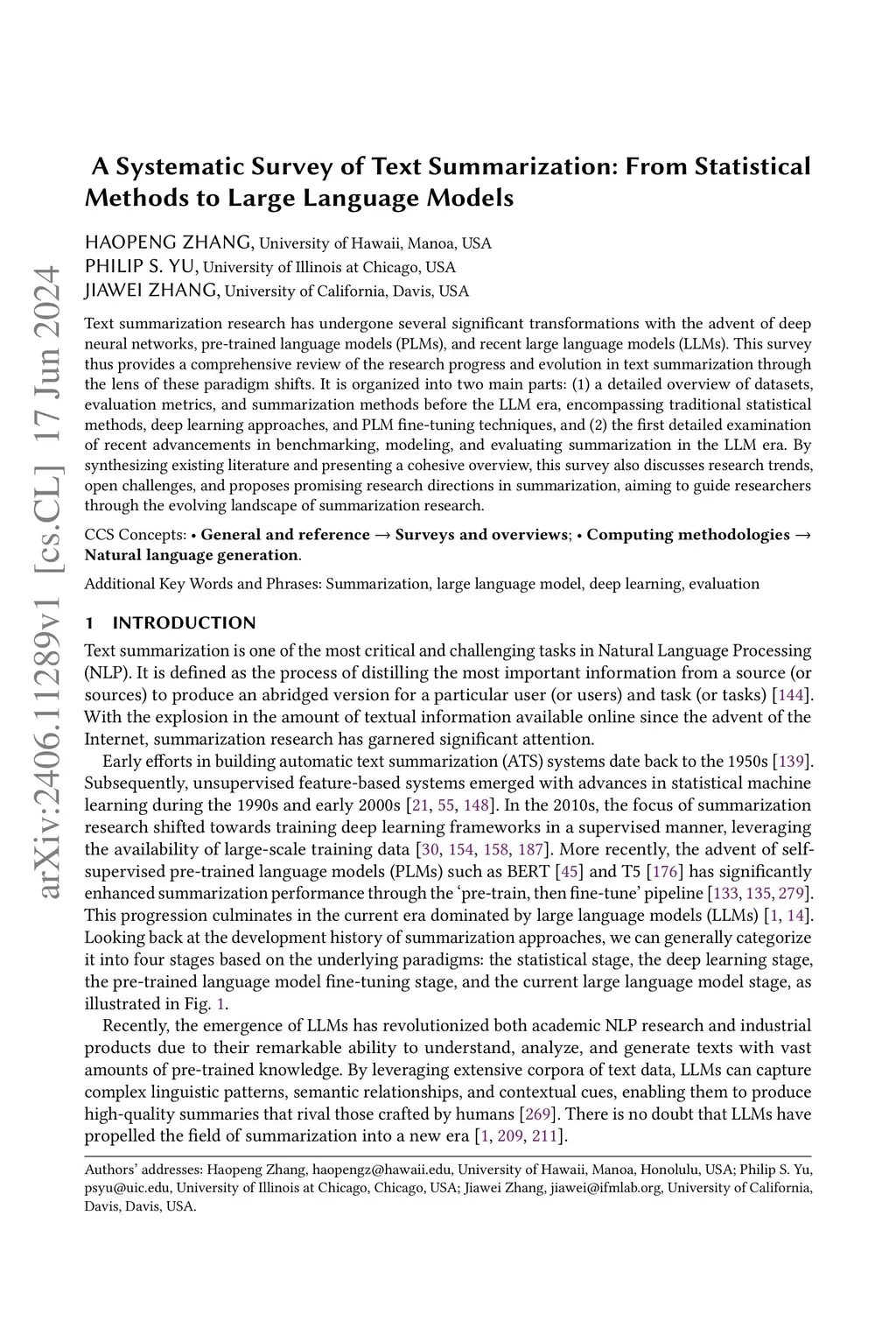 Text summarization research has undergone several significant transformations with the advent of deep neural networks, pre-trained language models (PLMs), and recent large language models (LLMs). This survey thus provides a comprehensive review of the research progress and evolution in text summarization through the lens of these paradigm shifts. It is organized into two main parts: (1) a detailed overview of datasets, evaluation metrics, and summarization methods before the LLM era, encompassing traditional statistical methods, deep learning approaches, and PLM fine-tuning techniques, and (2) the first detailed examination of recent advancements in benchmarking, modeling, and evaluating summarization in the LLM era. By synthesizing existing literature and presenting a cohesive overview, this survey also discusses research trends, open challenges, and proposes promising research directions in summarization, aiming to guide researchers through the evolving landscape of summarization research.