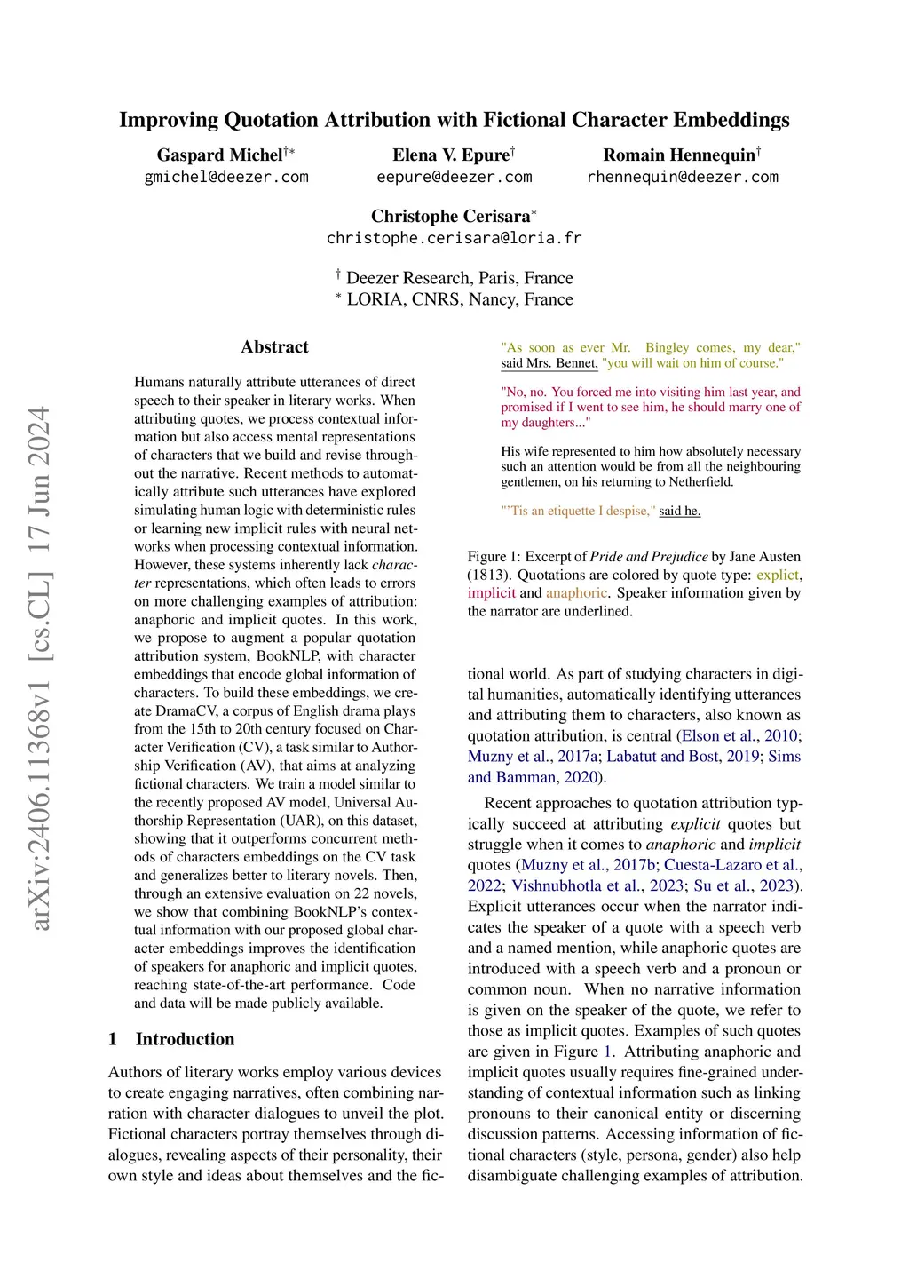 Improving Quotation Attribution with Fictional Character Embeddings