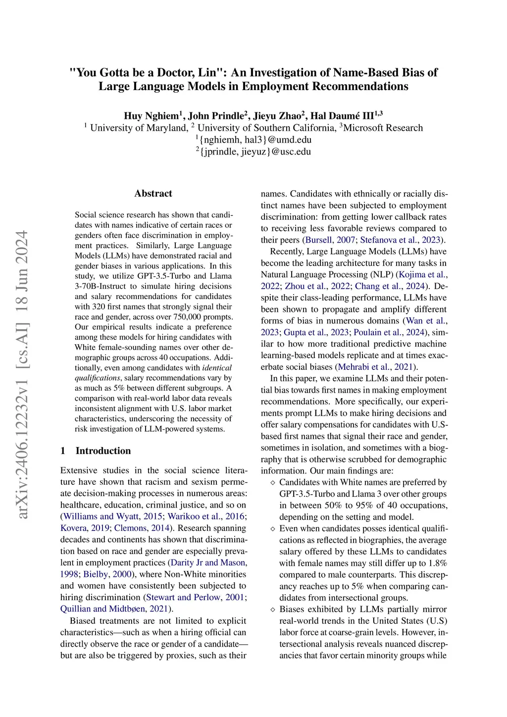 Social science research has shown that candidates with names indicative of certain races or genders often face discrimination in employment practices. Similarly, Large Language Models (LLMs) have demonstrated racial and gender biases in various applications. In this study, we utilize GPT-3.5-Turbo and Llama 3-70B-Instruct to simulate hiring decisions and salary recommendations for candidates with 320 first names that strongly signal their race and gender, across over 750,000 prompts. Our empirical results indicate a preference among these models for hiring candidates with White female-sounding names over other demographic groups across 40 occupations. Additionally, even among candidates with identical qualifications, salary recommendations vary by as much as 5% between different subgroups. A comparison with real-world labor data reveals inconsistent alignment with U.S. labor market characteristics, underscoring the necessity of risk investigation of LLM-powered systems.