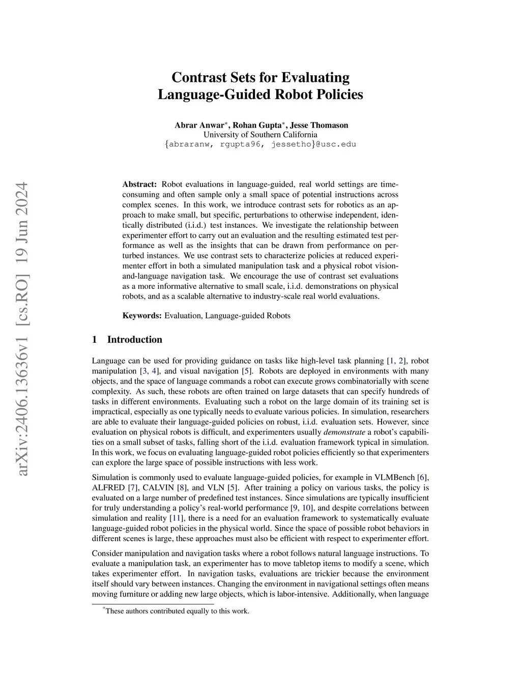 Robot evaluations in language-guided, real world settings are time-consuming and often sample only a small space of potential instructions across complex scenes. In this work, we introduce contrast sets for robotics as an approach to make small, but specific, perturbations to otherwise independent, identically distributed (i.i.d.) test instances. We investigate the relationship between experimenter effort to carry out an evaluation and the resulting estimated test performance as well as the insights that can be drawn from performance on perturbed instances. We use contrast sets to characterize policies at reduced experimenter effort in both a simulated manipulation task and a physical robot vision-and-language navigation task. We encourage the use of contrast set evaluations as a more informative alternative to small scale, i.i.d. demonstrations on physical robots, and as a scalable alternative to industry-scale real world evaluations.