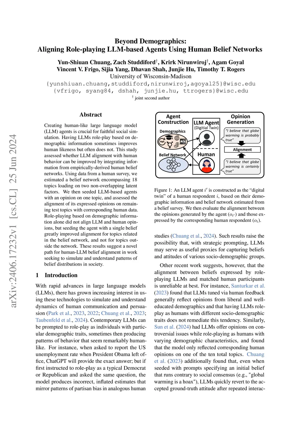 Creating human-like large language model (LLM) agents is crucial for faithful social simulation. Having LLMs role-play based on demographic information sometimes improves human likeness but often does not. This study assessed whether LLM alignment with human behavior can be improved by integrating information from empirically-derived human belief networks. Using data from a human survey, we estimated a belief network encompassing 18 topics loading on two non-overlapping latent factors. We then seeded LLM-based agents with an opinion on one topic, and assessed the alignment of its expressed opinions on remaining test topics with corresponding human data. Role-playing based on demographic information alone did not align LLM and human opinions, but seeding the agent with a single belief greatly improved alignment for topics related in the belief network, and not for topics outside the network. These results suggest a novel path for human-LLM belief alignment in work seeking to simulate and understand patterns of belief distributions in society.