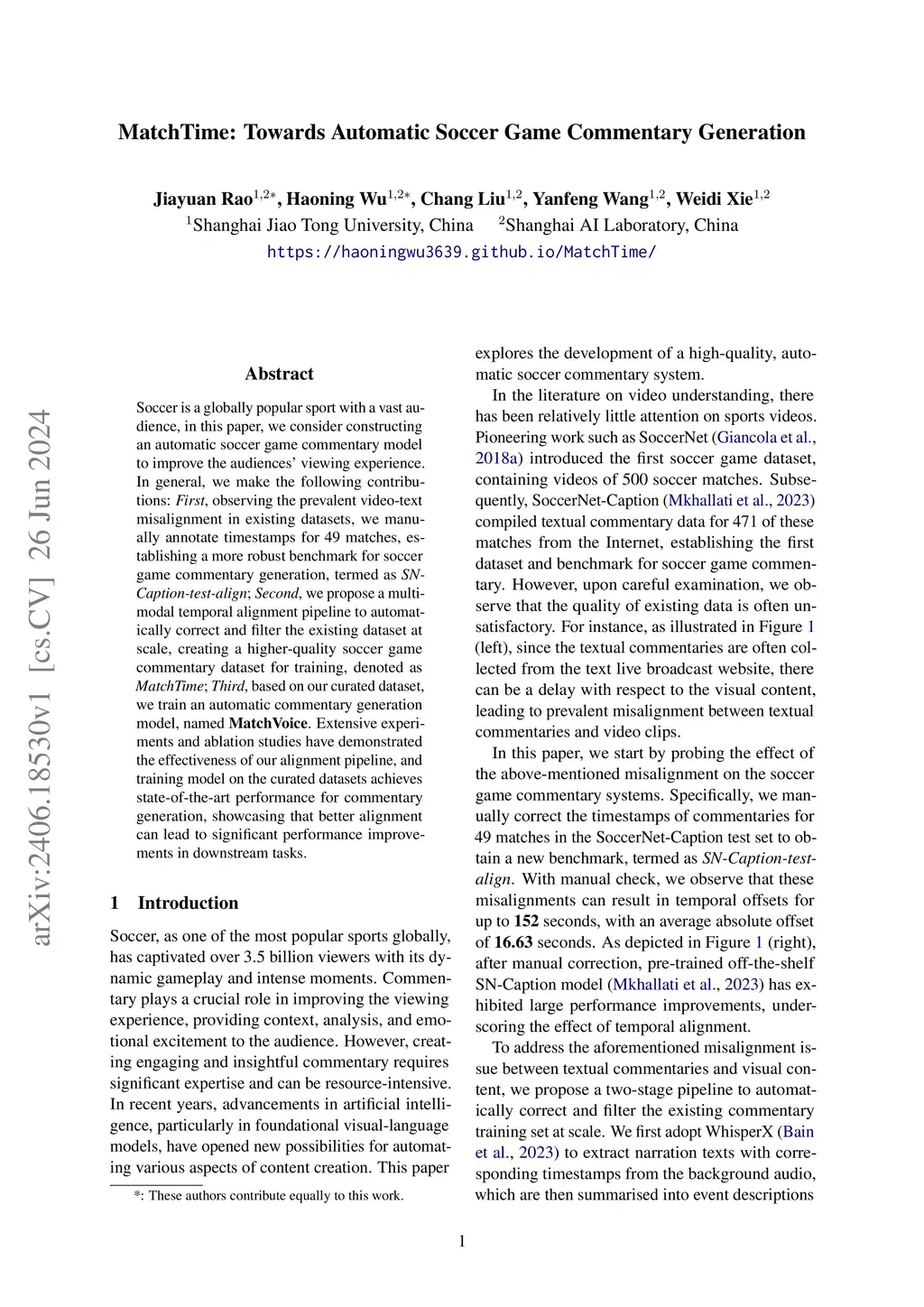 Soccer is a globally popular sport with a vast audience, in this paper, we consider constructing an automatic soccer game commentary model to improve the audiences' viewing experience. In general, we make the following contributions: First, observing the prevalent video-text misalignment in existing datasets, we manually annotate timestamps for 49 matches, establishing a more robust benchmark for soccer game commentary generation, termed as SN-Caption-test-align; Second, we propose a multi-modal temporal alignment pipeline to automatically correct and filter the existing dataset at scale, creating a higher-quality soccer game commentary dataset for training, denoted as MatchTime; Third, based on our curated dataset, we train an automatic commentary generation model, named MatchVoice. Extensive experiments and ablation studies have demonstrated the effectiveness of our alignment pipeline, and training model on the curated datasets achieves state-of-the-art performance for commentary generation, showcasing that better alignment can lead to significant performance improvements in downstream tasks.