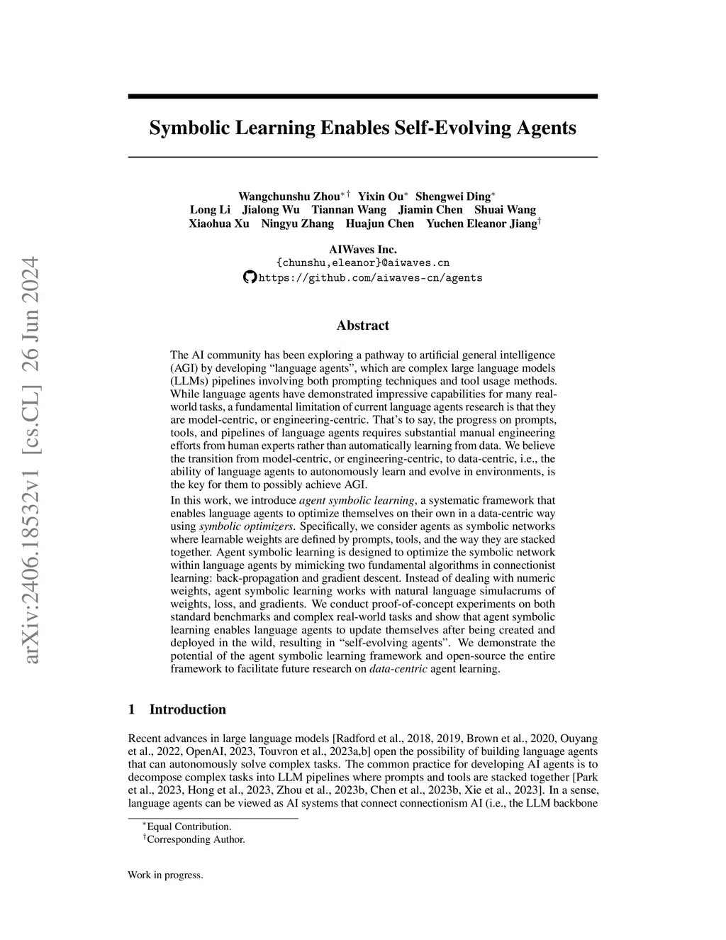 The AI community has been exploring a pathway to artificial general intelligence (AGI) by developing "language agents", which are complex large language models (LLMs) pipelines involving both prompting techniques and tool usage methods. While language agents have demonstrated impressive capabilities for many real-world tasks, a fundamental limitation of current language agents research is that they are model-centric, or engineering-centric. That's to say, the progress on prompts, tools, and pipelines of language agents requires substantial manual engineering efforts from human experts rather than automatically learning from data. We believe the transition from model-centric, or engineering-centric, to data-centric, i.e., the ability of language agents to autonomously learn and evolve in environments, is the key for them to possibly achieve AGI. In this work, we introduce agent symbolic learning, a systematic framework that enables language agents to optimize themselves on their own in a data-centric way using symbolic optimizers. Specifically, we consider agents as symbolic networks where learnable weights are defined by prompts, tools, and the way they are stacked together. Agent symbolic learning is designed to optimize the symbolic network within language agents by mimicking two fundamental algorithms in connectionist learning: back-propagation and gradient descent. Instead of dealing with numeric weights, agent symbolic learning works with natural language simulacrums of weights, loss, and gradients. We conduct proof-of-concept experiments on both standard benchmarks and complex real-world tasks and show that agent symbolic learning enables language agents to update themselves after being created and deployed in the wild, resulting in "self-evolving agents".