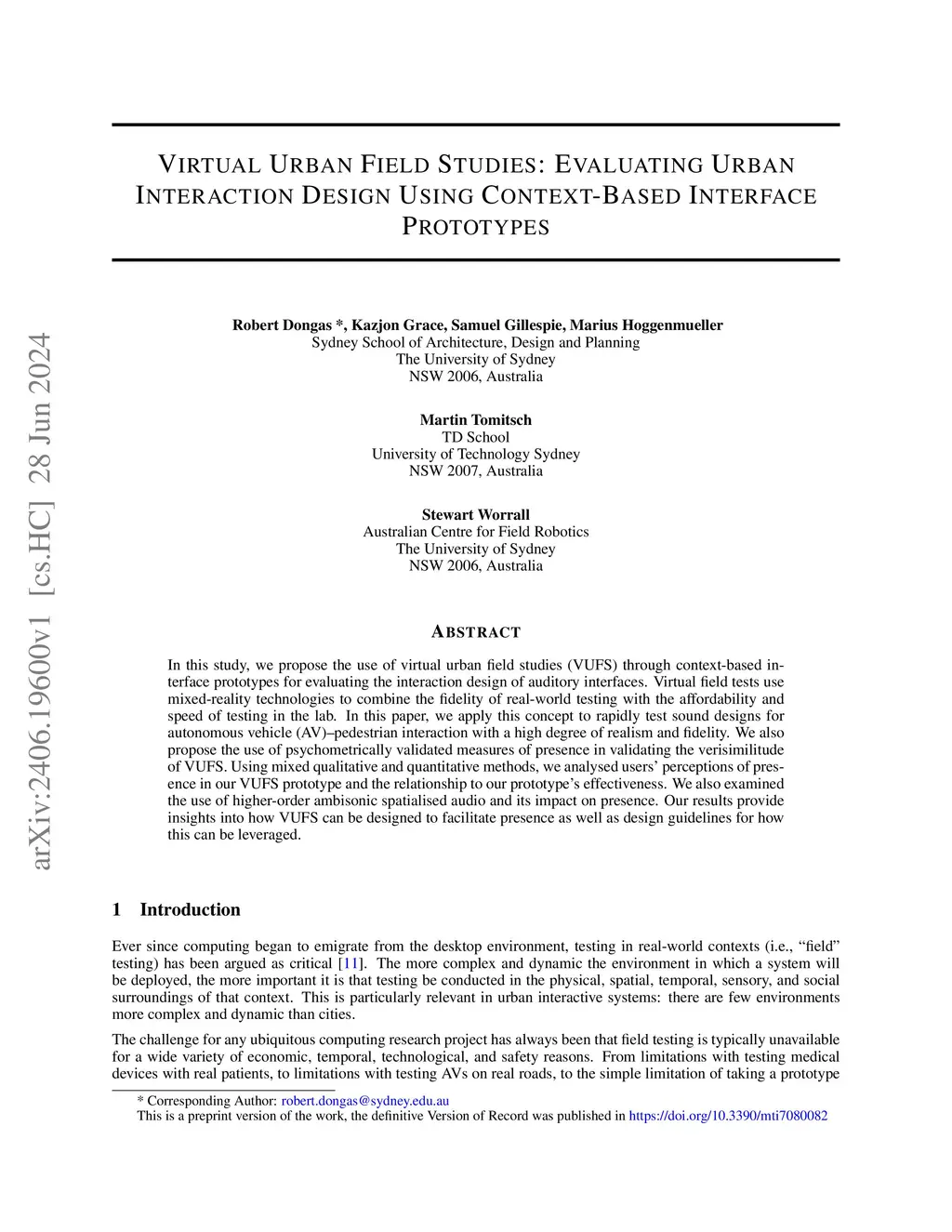 In this study, we propose the use of virtual urban field studies (VUFS) through context-based interface prototypes for evaluating the interaction design of auditory interfaces. Virtual field tests use mixed-reality technologies to combine the fidelity of real-world testing with the affordability and speed of testing in the lab. In this paper, we apply this concept to rapidly test sound designs for autonomous vehicle (AV)--pedestrian interaction with a high degree of realism and fidelity. We also propose the use of psychometrically validated measures of presence in validating the verisimilitude of VUFS. Using mixed qualitative and quantitative methods, we analysed users' perceptions of presence in our VUFS prototype and the relationship to our prototype's effectiveness. We also examined the use of higher-order ambisonic spatialised audio and its impact on presence. Our results provide insights into how VUFS can be designed to facilitate presence as well as design guidelines for how this can be leveraged.