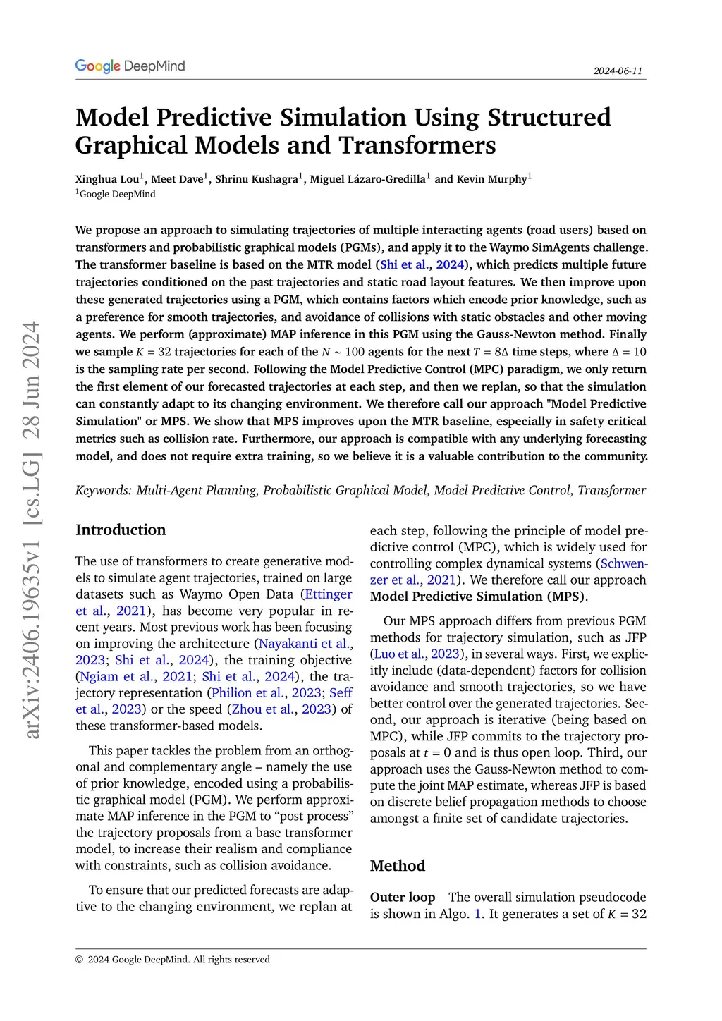 We propose an approach to simulating trajectories of multiple interacting agents (road users) based on transformers and probabilistic graphical models (PGMs), and apply it to the Waymo SimAgents challenge. The transformer baseline is based on the MTR model, which predicts multiple future trajectories conditioned on the past trajectories and static road layout features. We then improve upon these generated trajectories using a PGM, which contains factors which encode prior knowledge, such as a preference for smooth trajectories, and avoidance of collisions with static obstacles and other moving agents. We perform (approximate) MAP inference in this PGM using the Gauss-Newton method. Finally we sample trajectories for each of the agents for the next time steps, where is the sampling rate per second. Following the Model Predictive Control (MPC) paradigm, we only return the first element of our forecasted trajectories at each step, and then we replan, so that the simulation can constantly adapt to its changing environment. We therefore call our approach "Model Predictive Simulation" or MPS. We show that MPS improves upon the MTR baseline, especially in safety critical metrics such as collision rate. Furthermore, our approach is compatible with any underlying forecasting model, and does not require extra training, so we believe it is a valuable contribution to the community.
